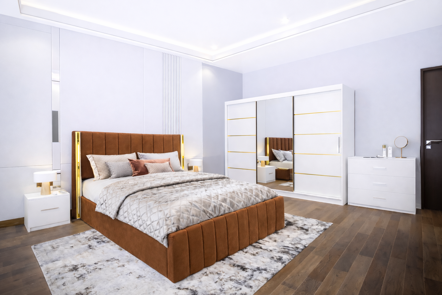 Dormitorul Cairo New impresionează prin designul modern și elegant, dominat de patul tapițat cu tăblie tapițată și accente aurii rafinate. Dressingul cu uși glisante și oglindă panoramică optimizează spațiul, iar nuanțele neutre și finisajele de calitate creează un ambient luxos și armonios. Cairo New — un dormitor contemporan pentru cei care apreciază confortul și stilul.