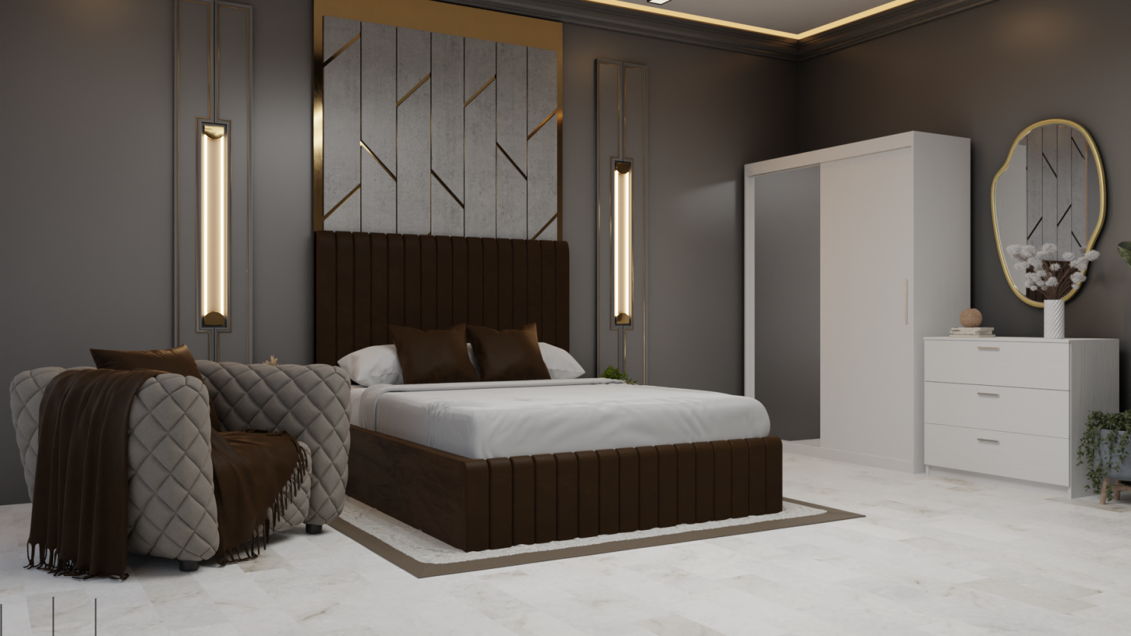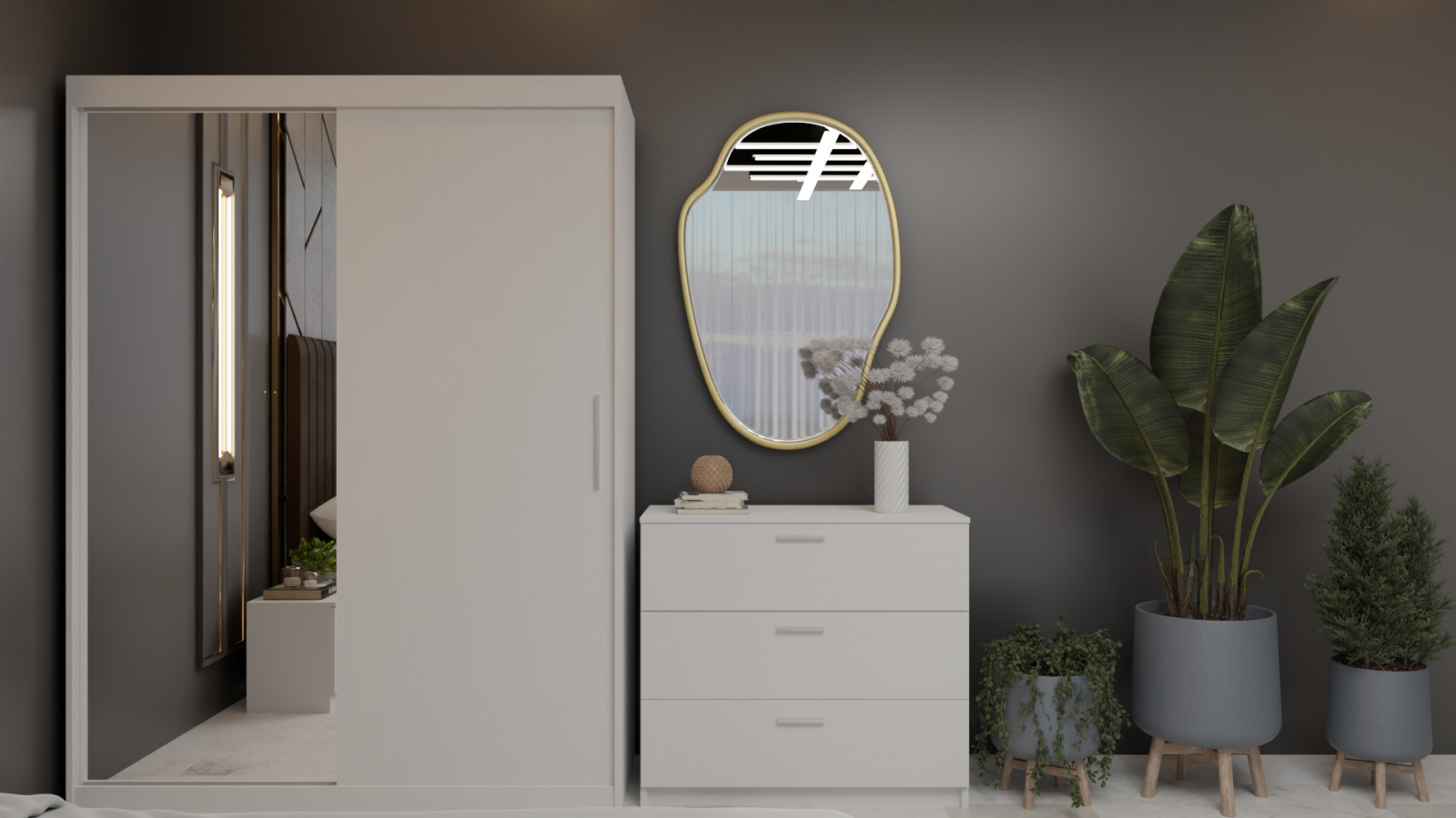 Dormitor Cairo Pat Tapitat Dressing 2 Usi Cu Oglinda Alb