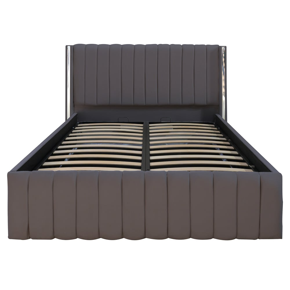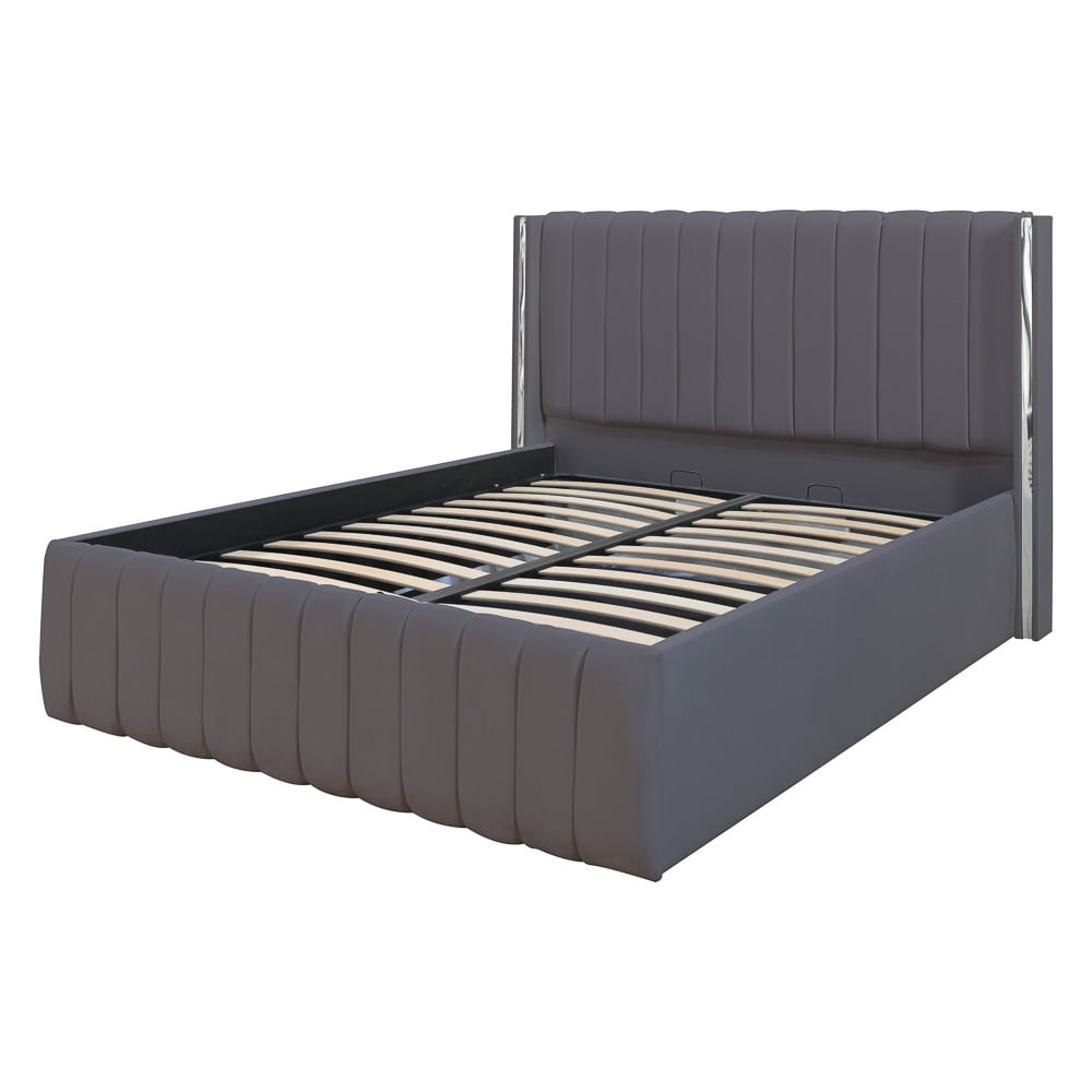 Tăblia înaltă, cu linii verticale atent realizate, oferă un aspect sofisticat și confort vizual, iar inserțiile argintii de pe laterale completează designul cu o notă de lux subtil.