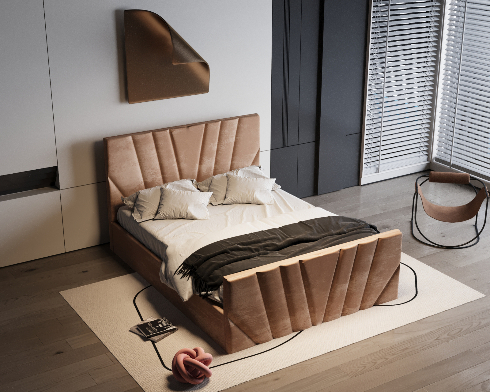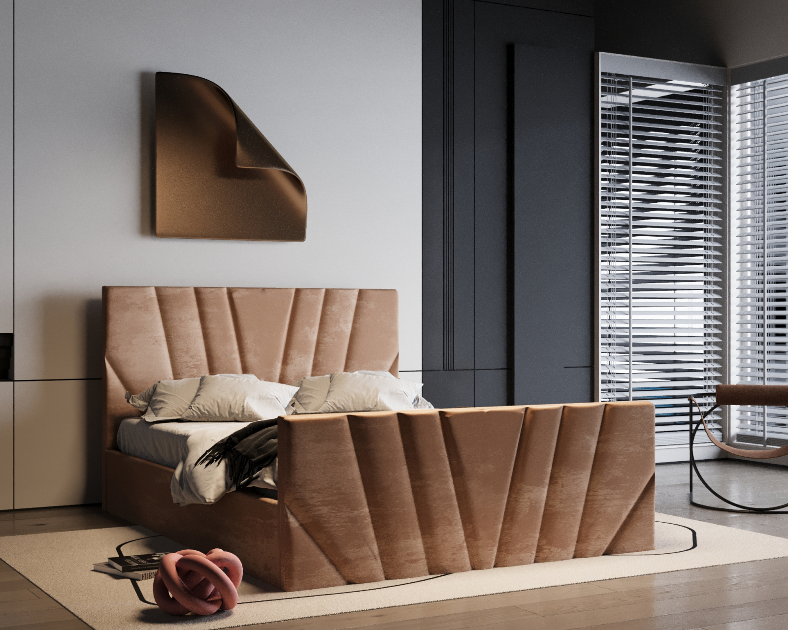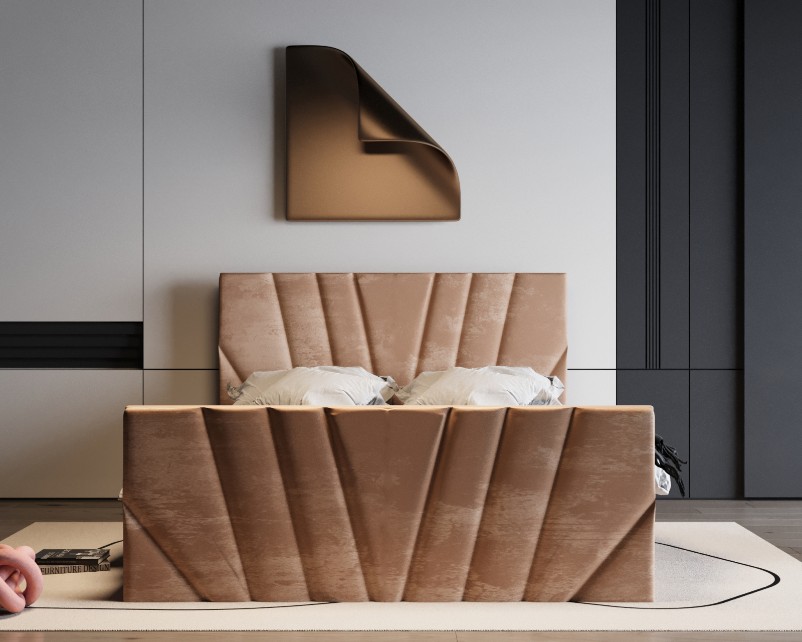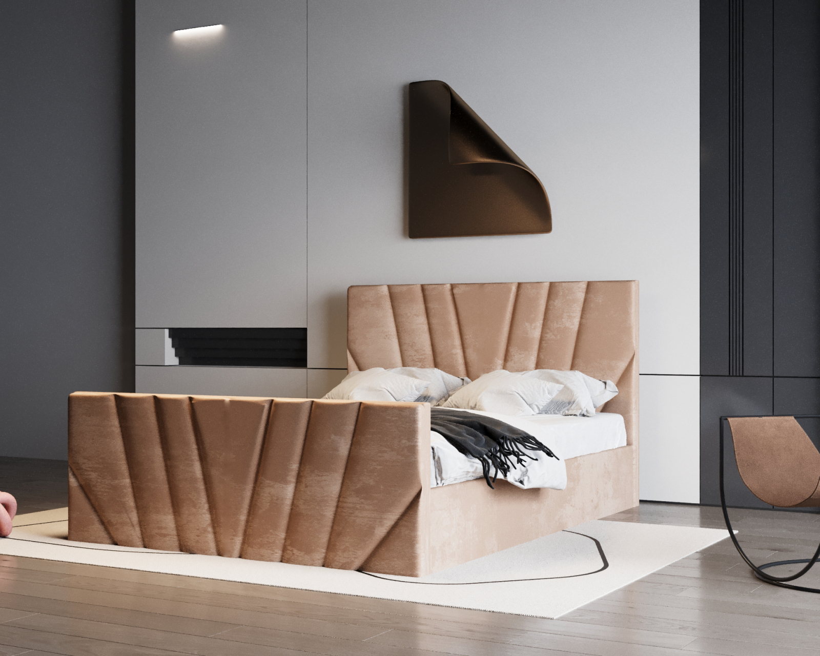 Patul Tony impresionează prin designul său modern și tapițeria luxoasă. Liniile geometrice și textura catifelată adaugă rafinament oricărui dormitor, oferind în același timp un confort excelent pentru odihnă.