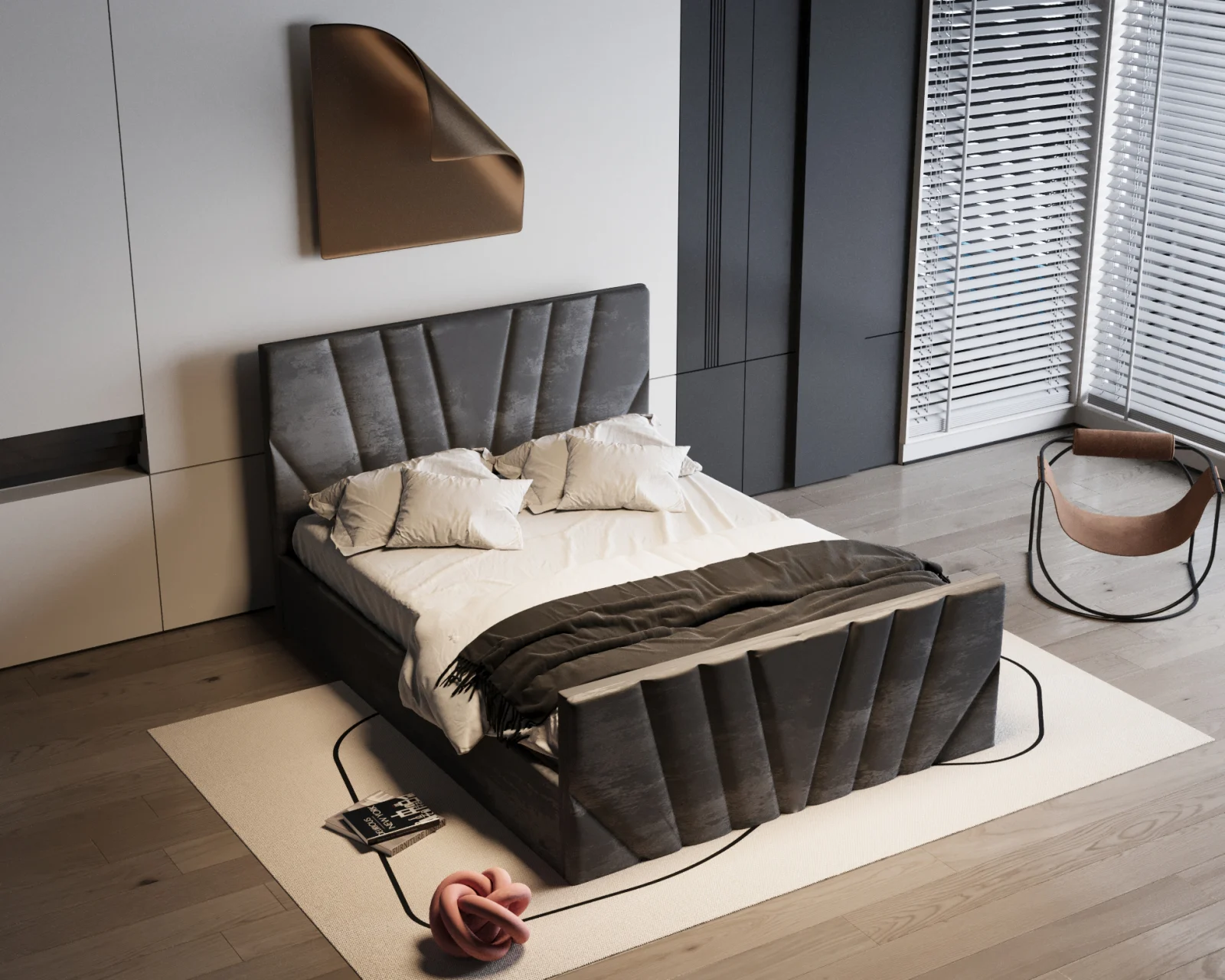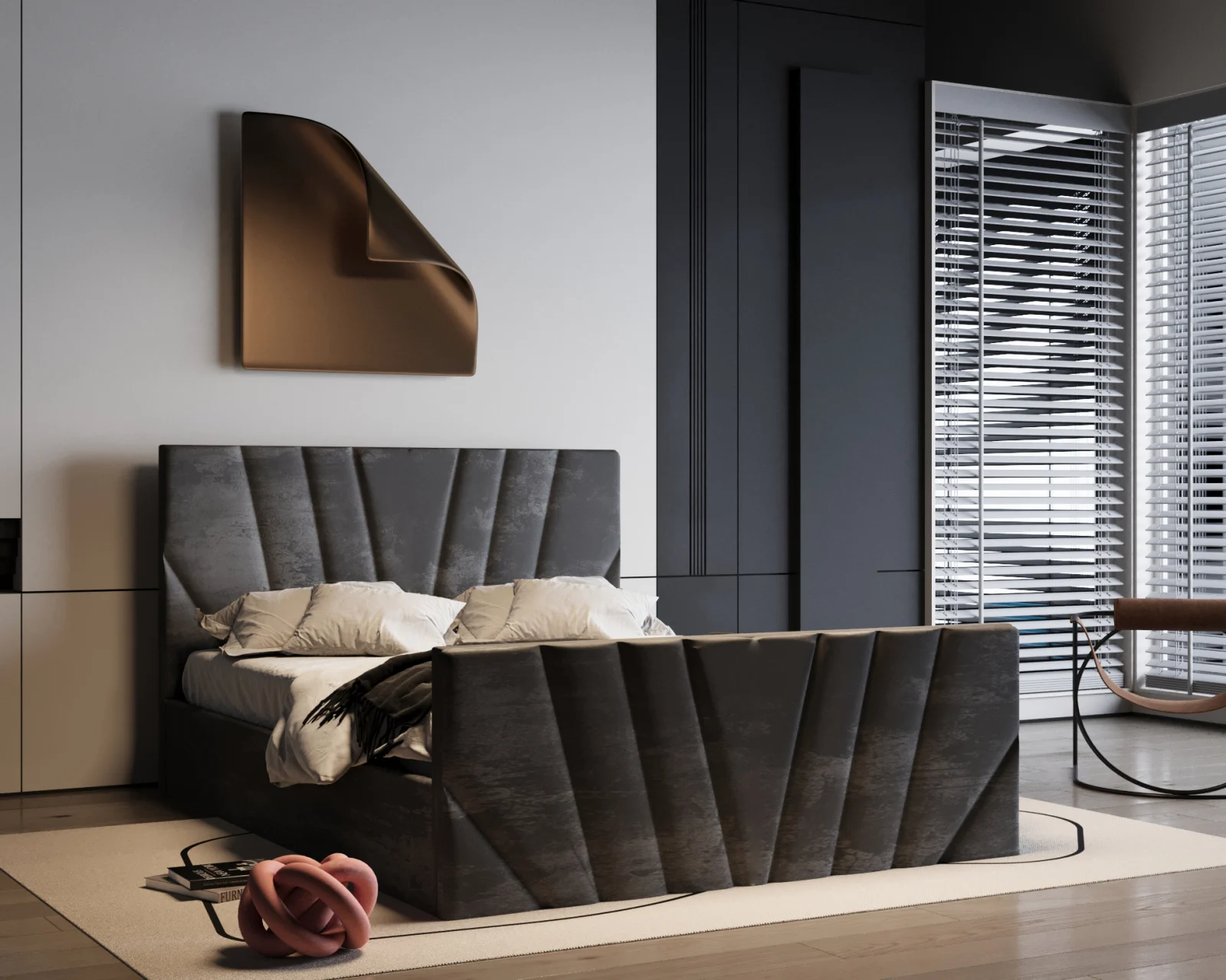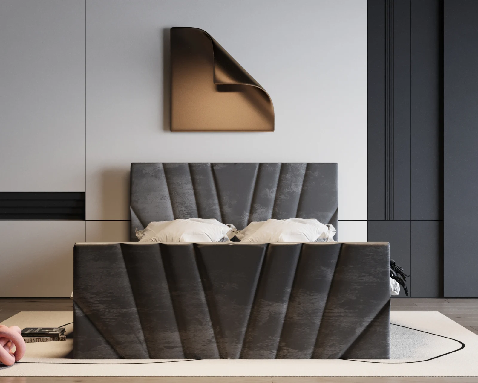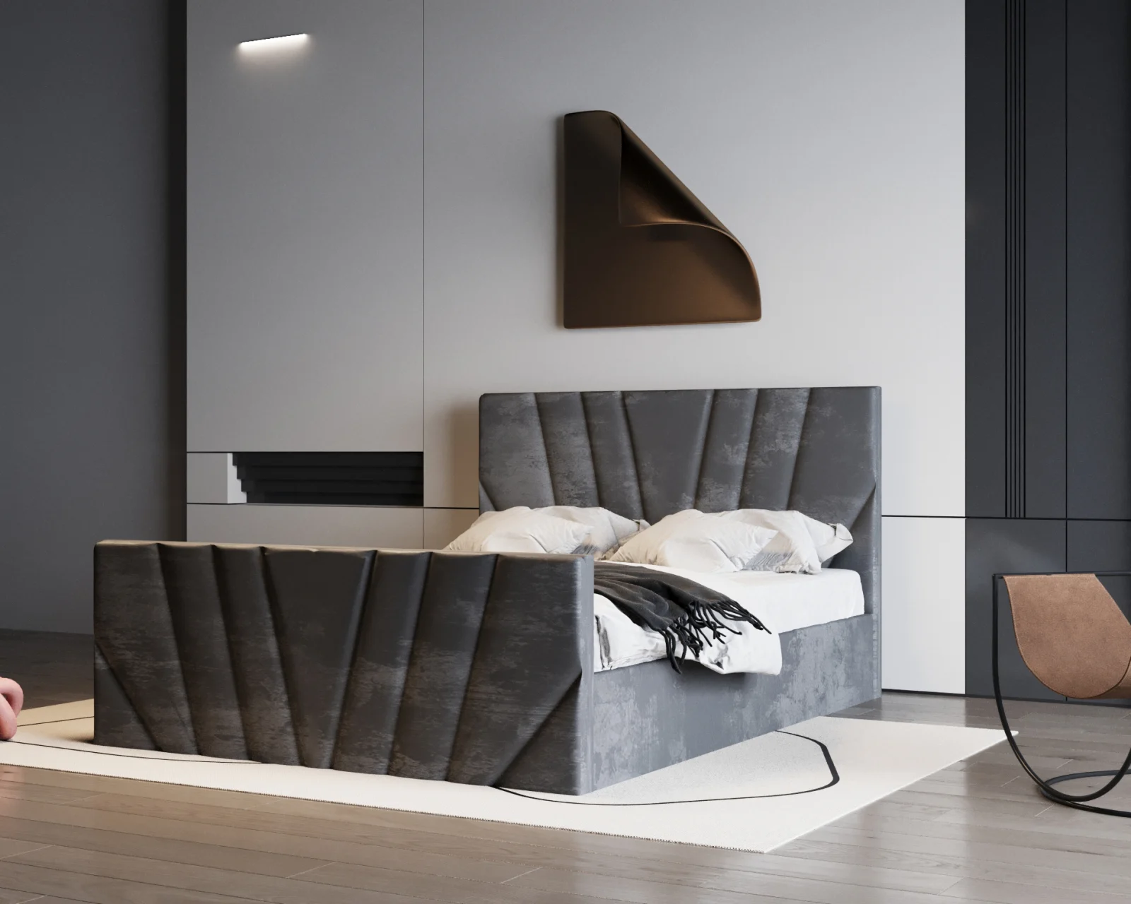 Patul Tony impresionează prin designul său modern și tapițeria luxoasă. Liniile geometrice și textura catifelată adaugă rafinament oricărui dormitor, oferind în același timp un confort excelent pentru odihnă.