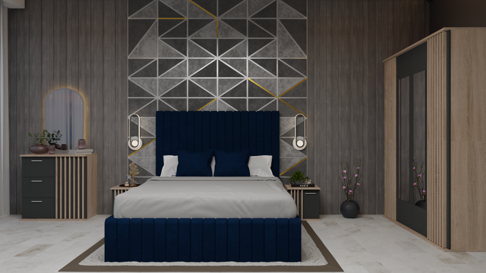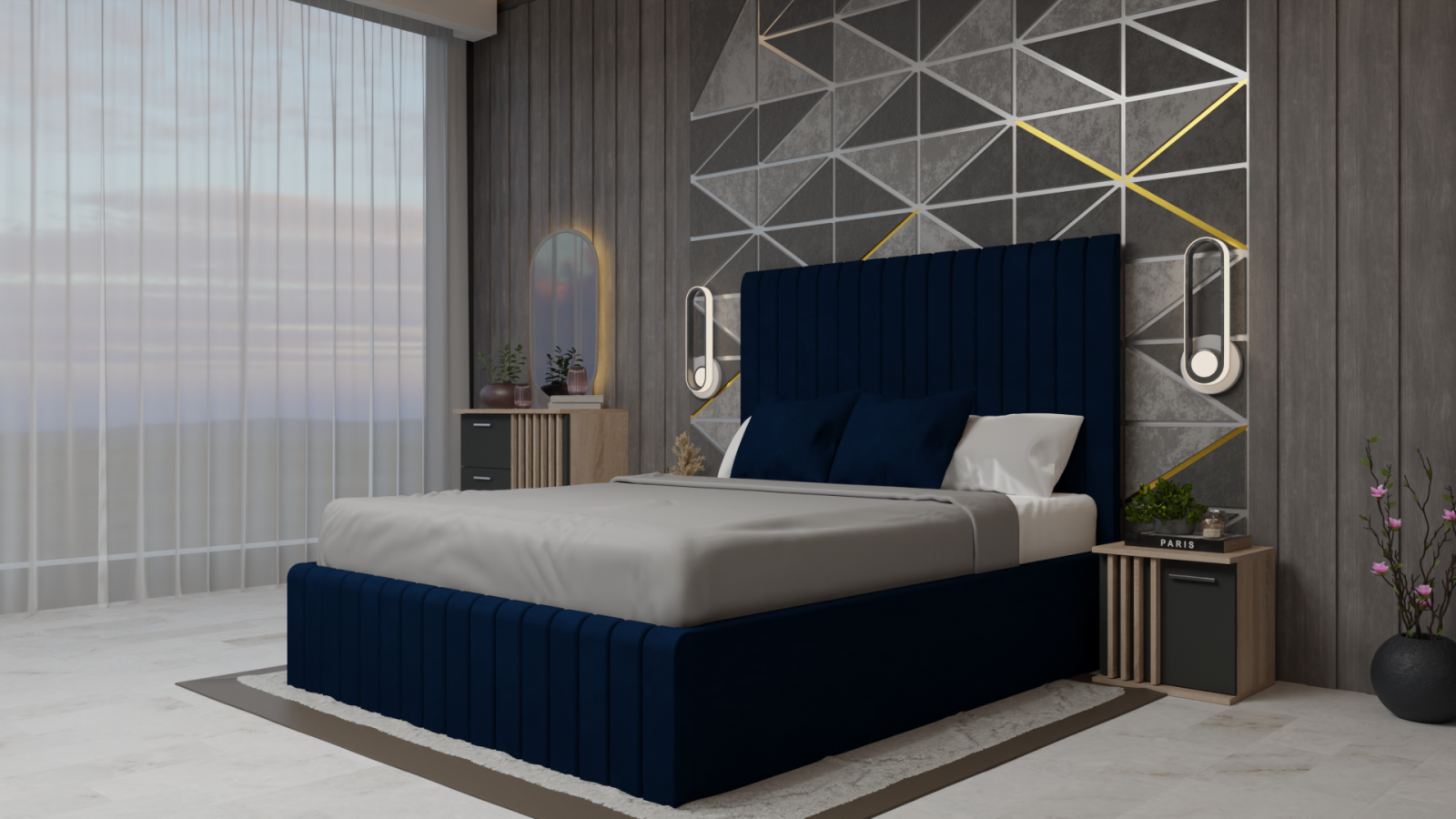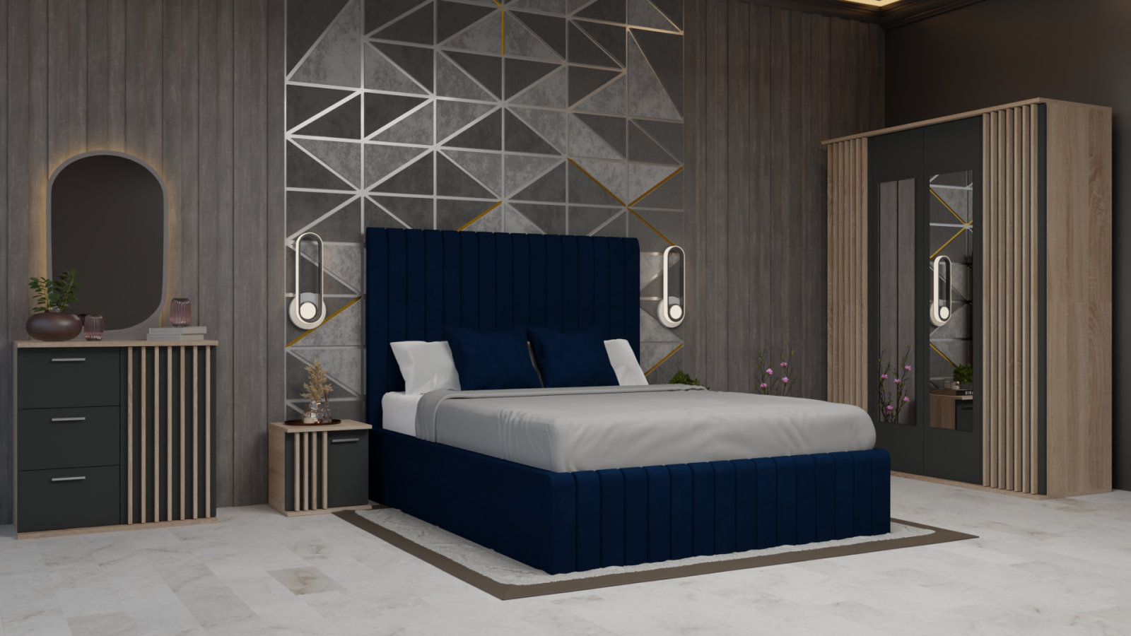 Colecția Dallas se remarcă prin designul modern și elegant, accentuat de riflajele decorative care aduc profunzime și rafinament spațiului. Patul Cairo tapițat în catifea fină, cu tăblie înaltă și linii contemporane, oferă un confort desăvârșit și un plus de stil. Ansamblul creează o atmosferă caldă, echilibrată și sofisticată – ideală pentru un dormitor modern și primitor.