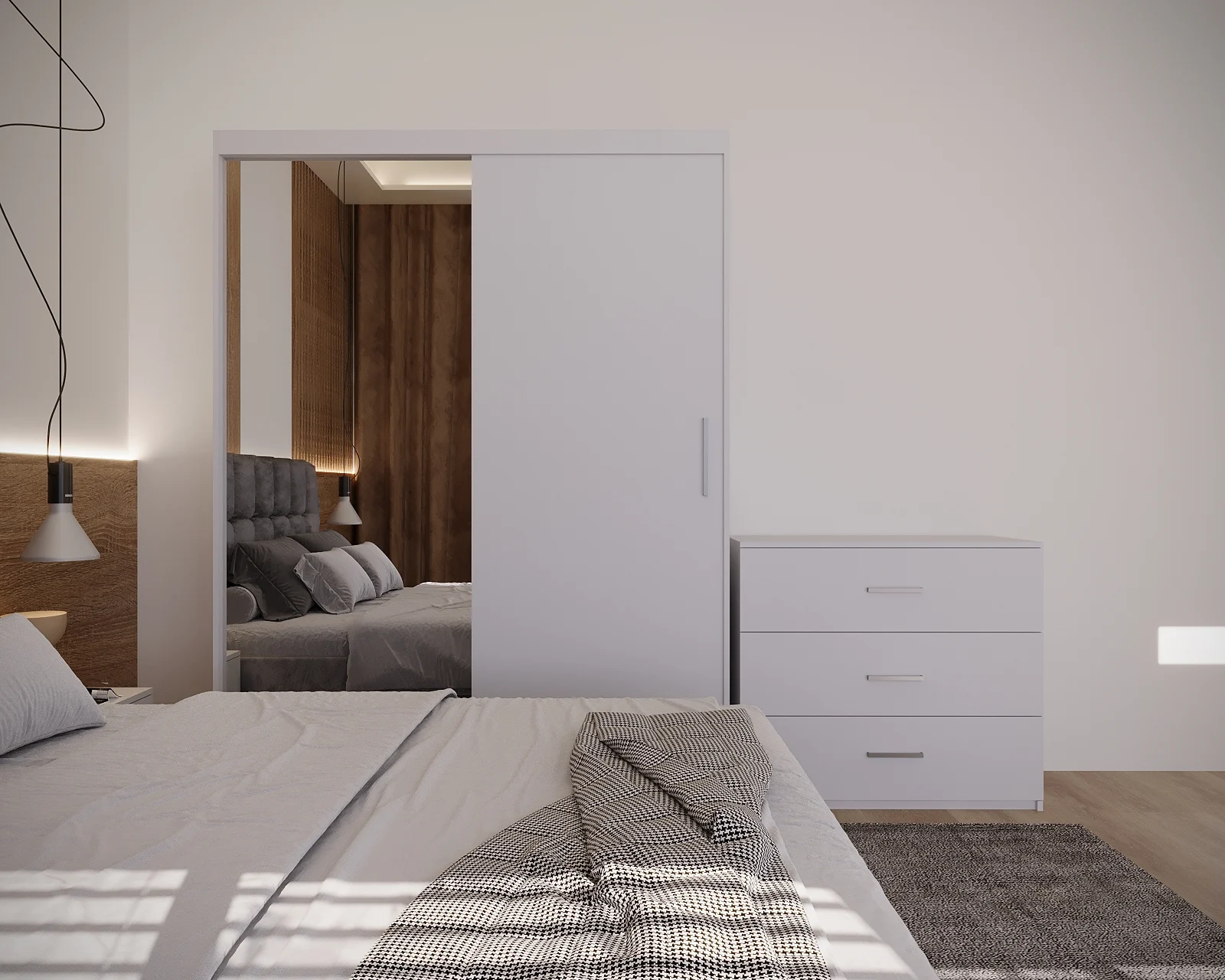 Dormitor Regal cu Pat Tapitat Stofa Gri cu dulap usi glisante Alb cu oglinda, noptiere si comoda