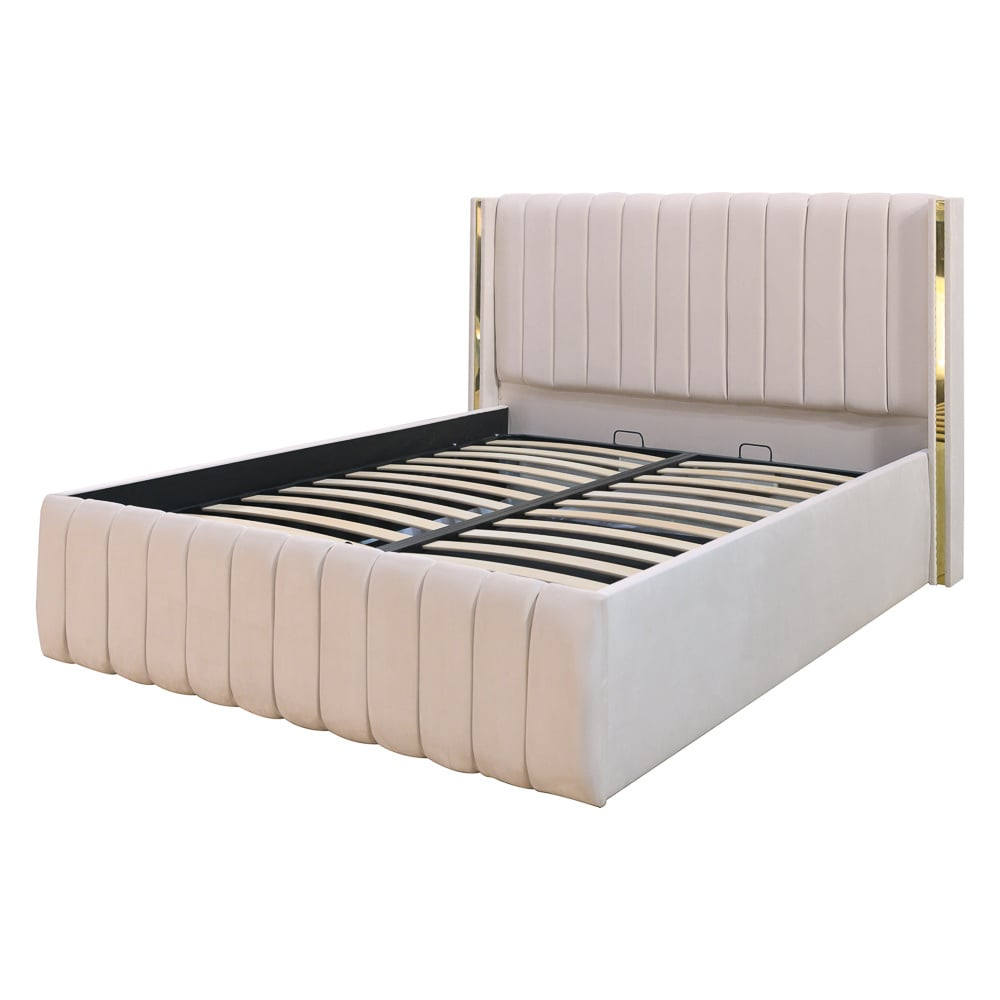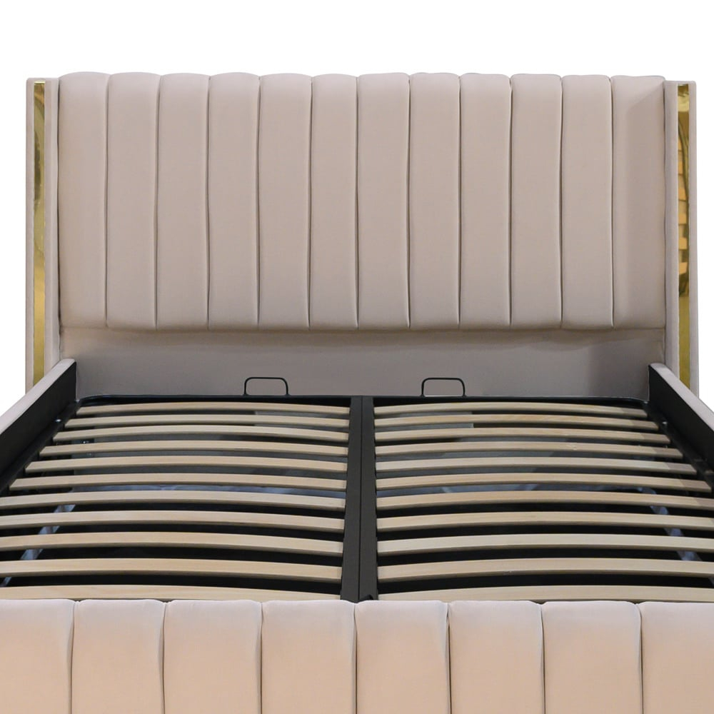 Tăblia înaltă, cu linii verticale atent realizate, oferă un aspect sofisticat și confort vizual, iar inserțiile aurii de pe laterale completează designul cu o notă de lux subtil.