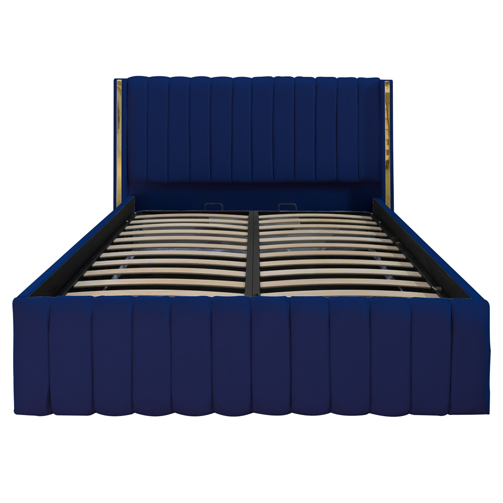 Tăblia înaltă, cu linii verticale atent realizate, oferă un aspect sofisticat și confort vizual, iar inserțiile aurii de pe laterale completează designul cu o notă de lux subtil.