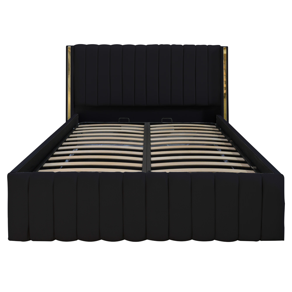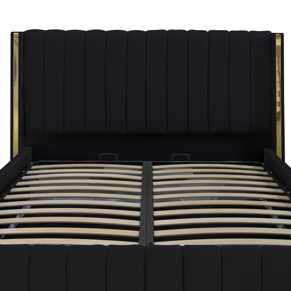Tăblia înaltă, cu linii verticale atent realizate, oferă un aspect sofisticat și confort vizual, iar inserțiile aurii de pe laterale completează designul cu o notă de lux subtil.