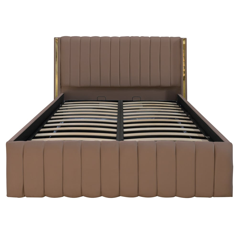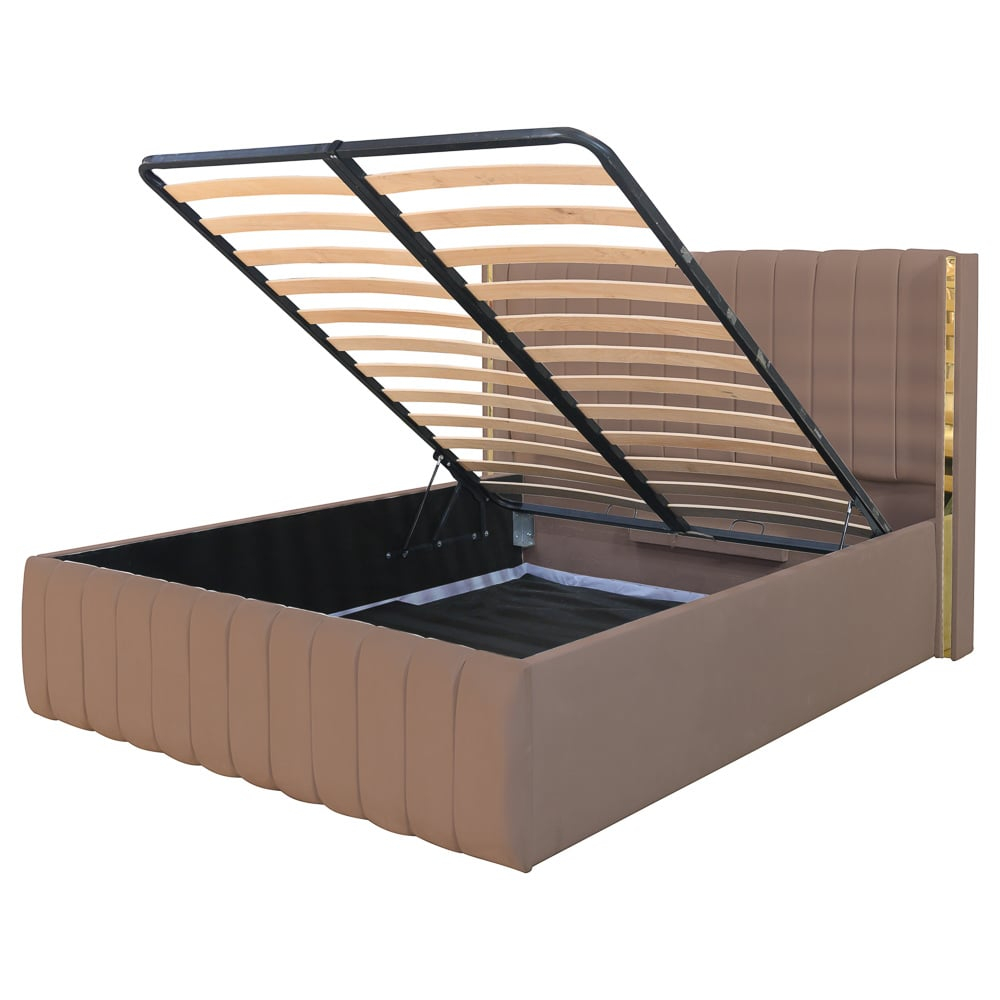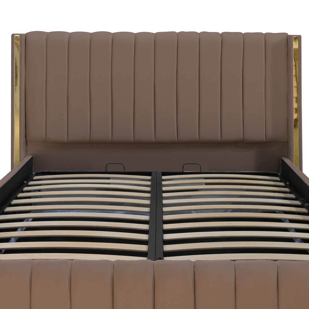 Tăblia înaltă, cu linii verticale atent realizate, oferă un aspect sofisticat și confort vizual, iar inserțiile aurii de pe laterale completează designul cu o notă de lux subtil.