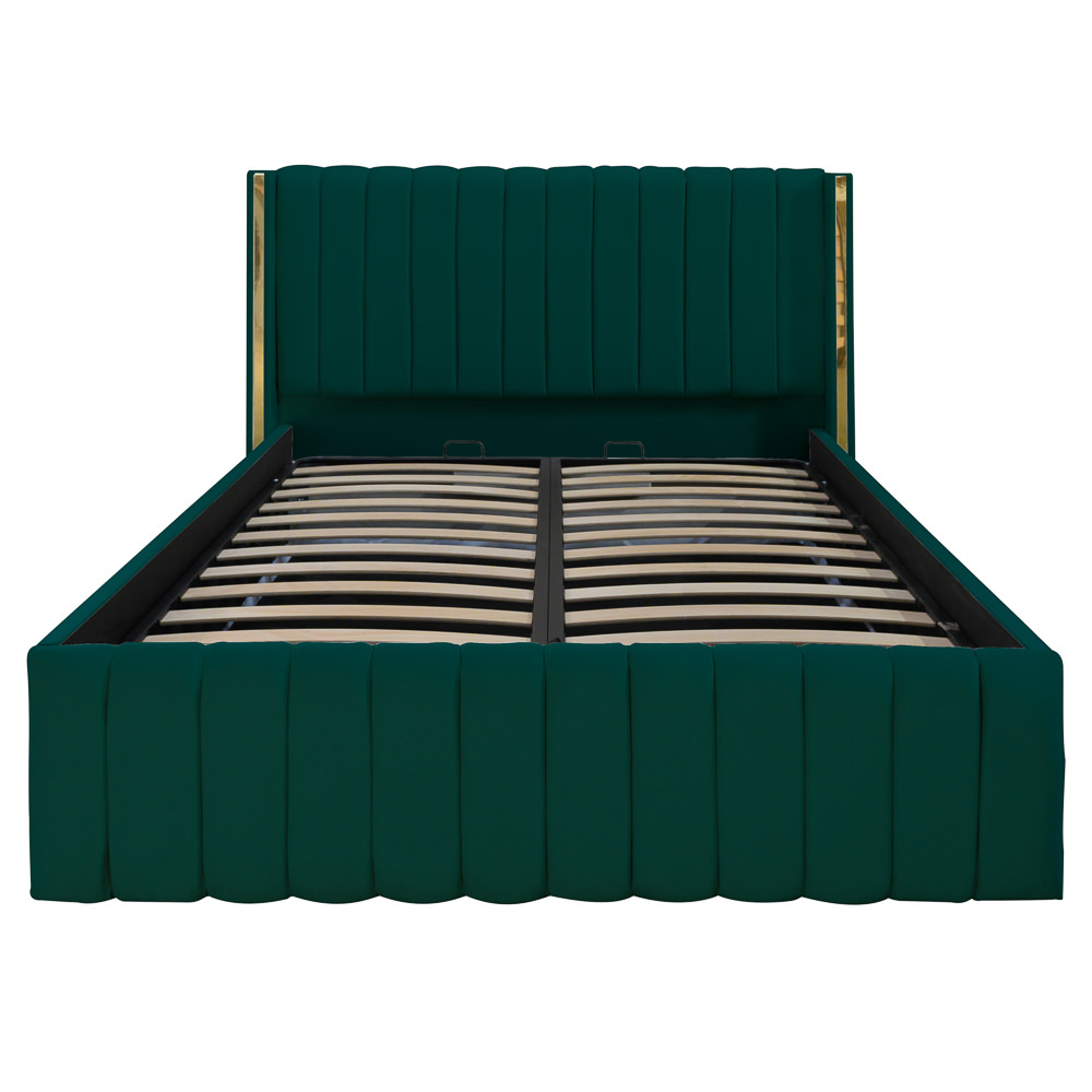 Tăblia înaltă, cu linii verticale atent realizate, oferă un aspect sofisticat și confort vizual, iar inserțiile aurii de pe laterale completează designul cu o notă de lux subtil.