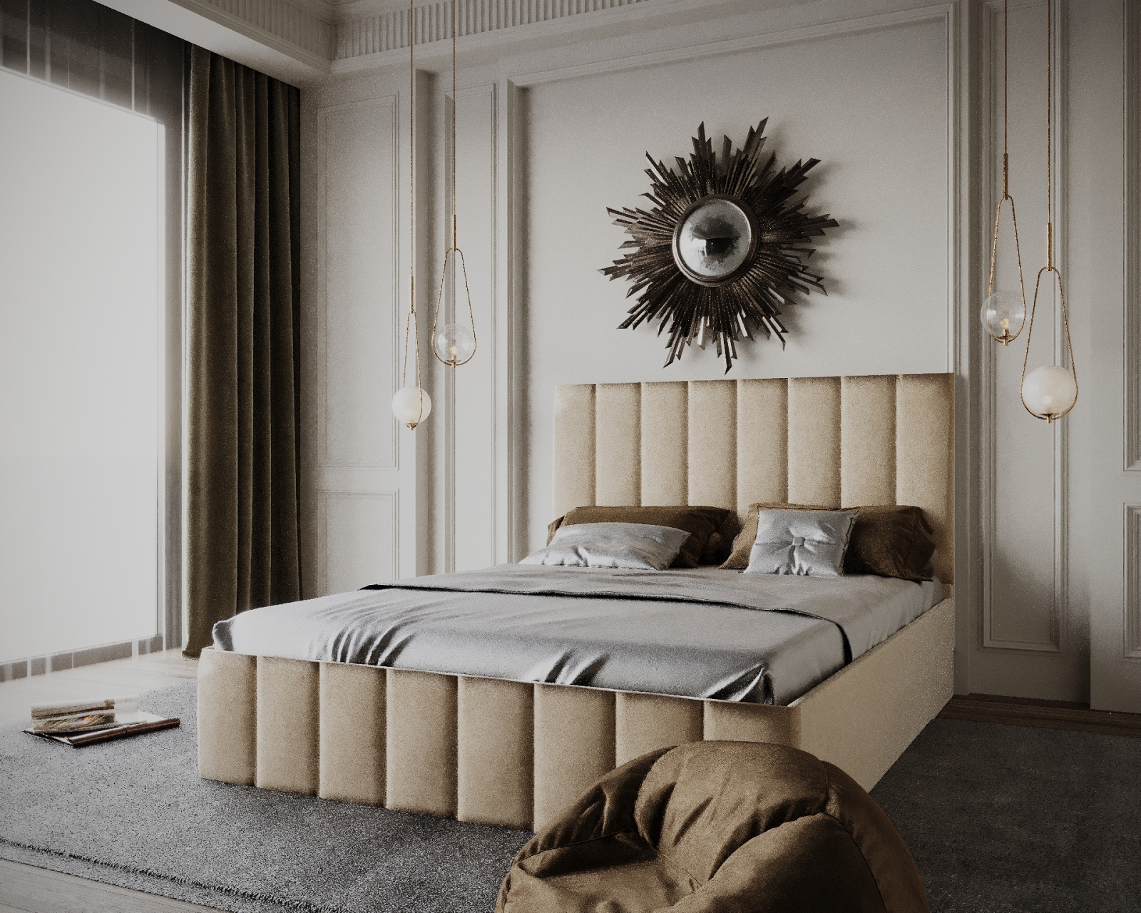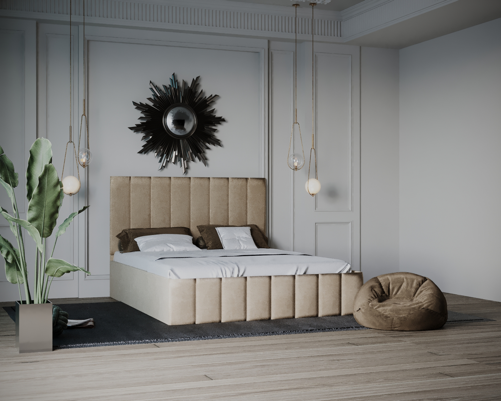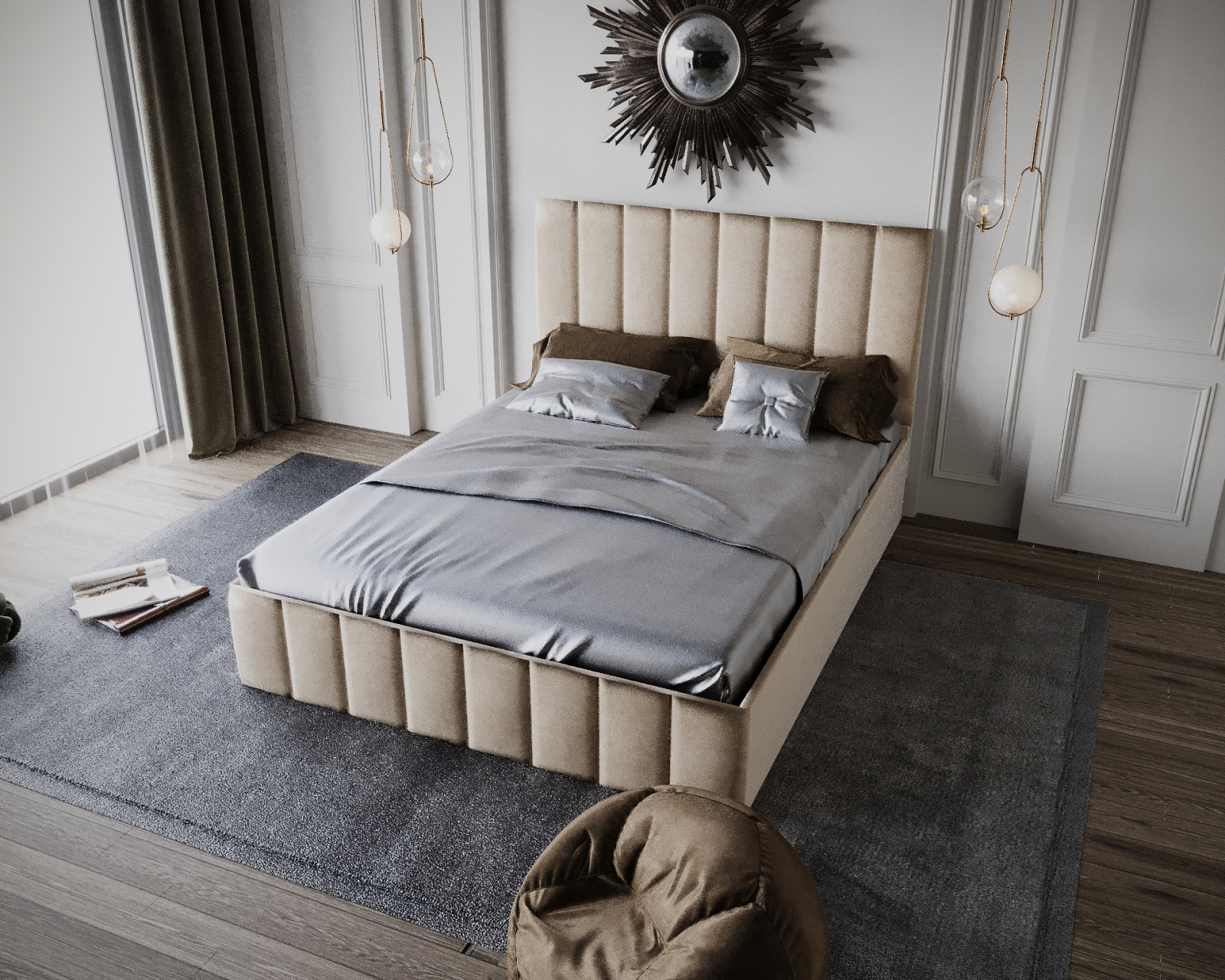 Patul este realizat din materiale calitative, are o strucura din pal melaminat fiind tapițat cu un material textil catifelat.
