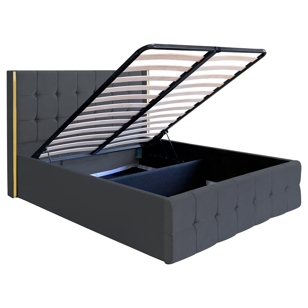 Tăblia înaltă, capitonată cu detalii geometrice, oferă un aspect impunător și un plus de confort atunci când te relaxezi. Structura solidă, realizată din materiale de calitate superioară, asigură rezistență în timp, iar somiera rabatabilă dezvăluie un spațiu generos de depozitare, ideal pentru lenjerii, perne sau alte obiecte personale.