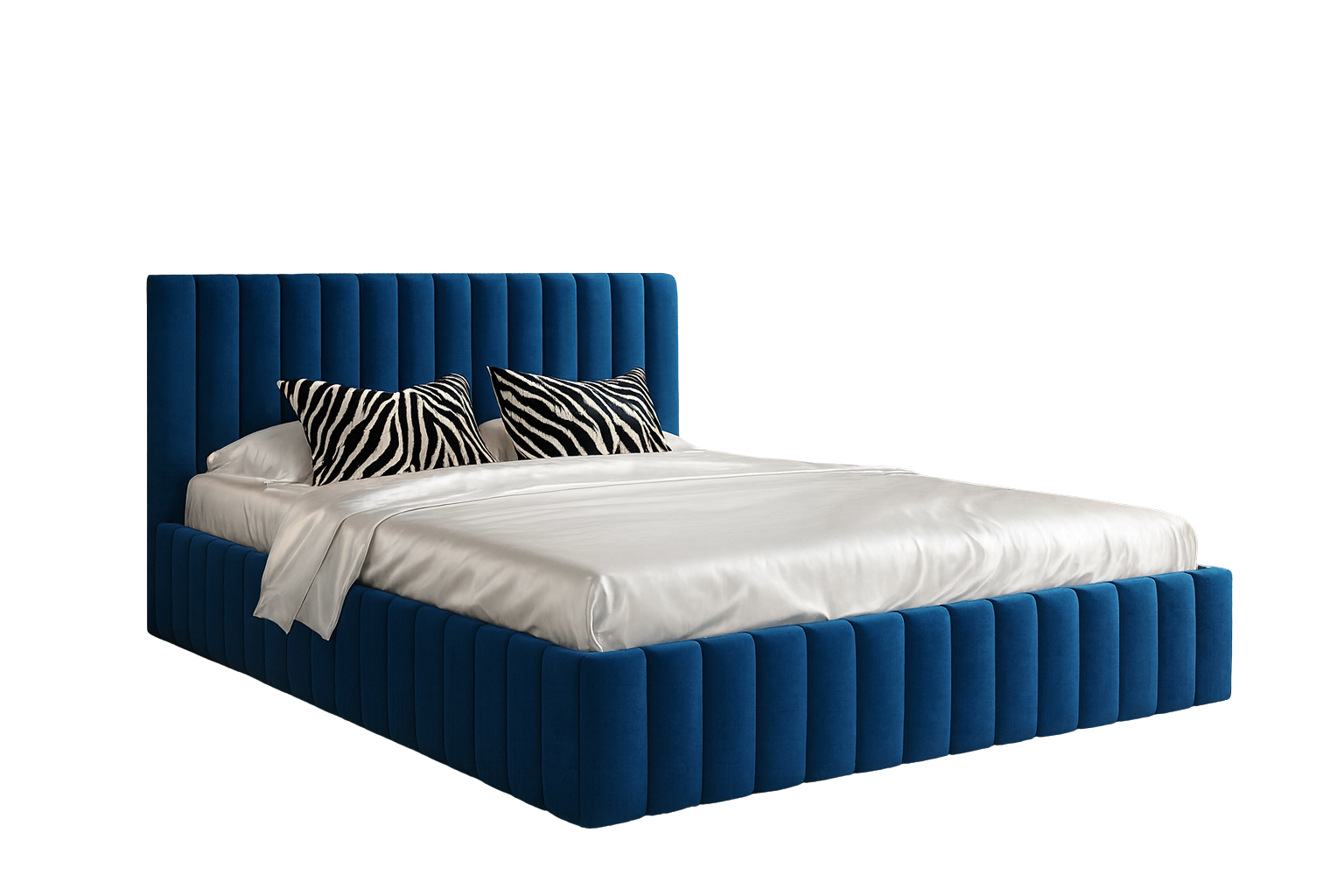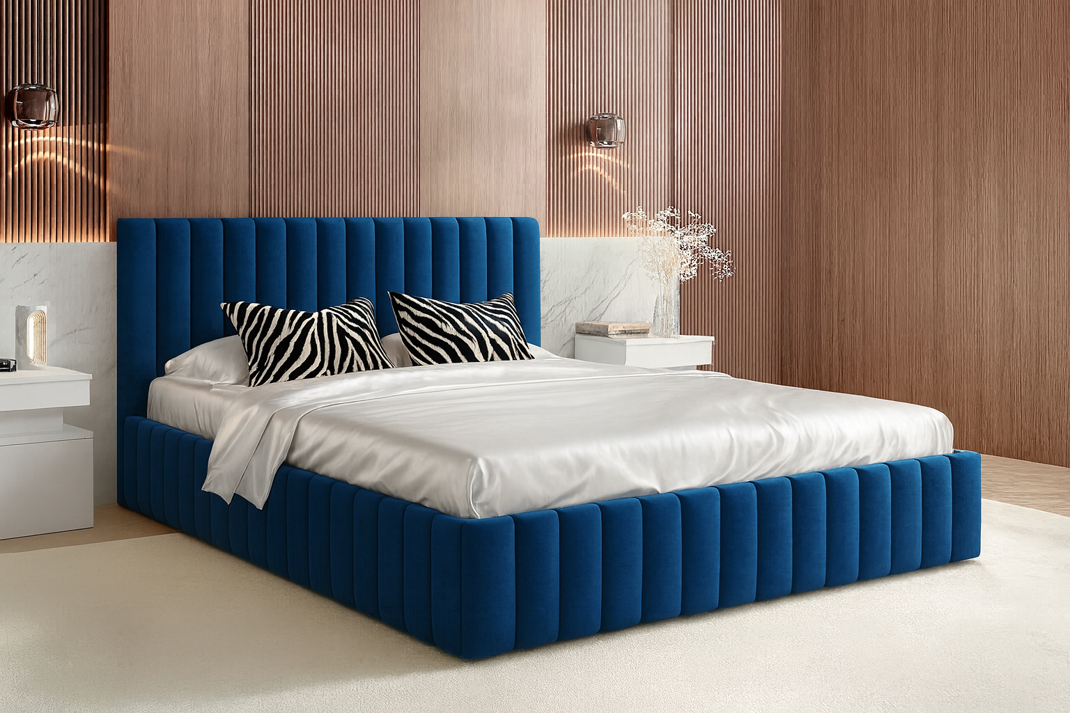 Realizat cu o atenție deosebită la detalii, patul face parte din Colecția Velvet, fiind tapițat integral cu catifea premium, moale la atingere și plăcută vizual. Textura sa fină conferă un aer luxos, iar tăblia înaltă, cu design vertical, oferă sprijin confortabil și un aspect modern.