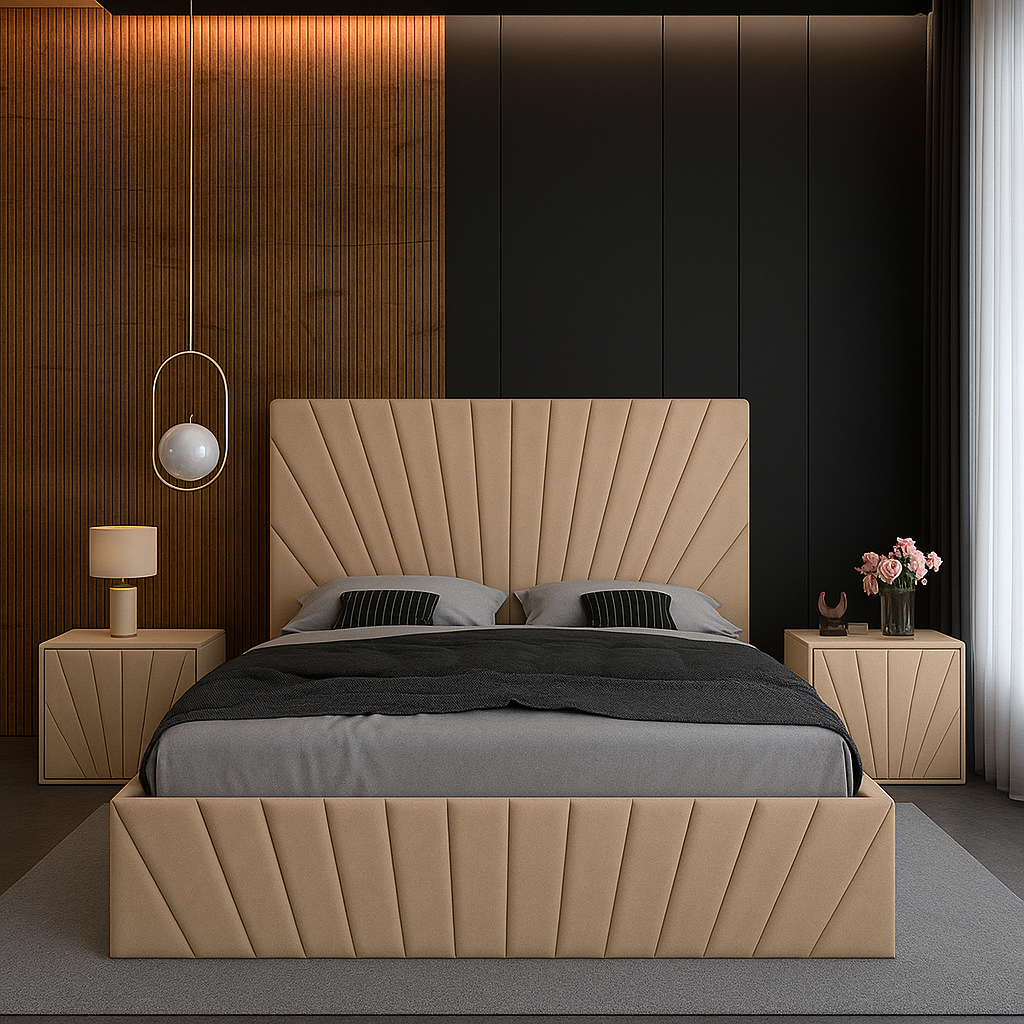 Colecția Solis aduce armonie și stil prin combinația perfectă dintre designul modern și confortul premium. Patul tapițat cu tăblie înaltă și detalii geometrice este completat de noptierele tapițate asortate, practice și elegante, care oferă un plus de unitate vizuală și rafinament. Realizată din catifea fină, în nuanțe sofisticate, Solis transformă dormitorul într-un spațiu cald, modern și plin de personalitate.