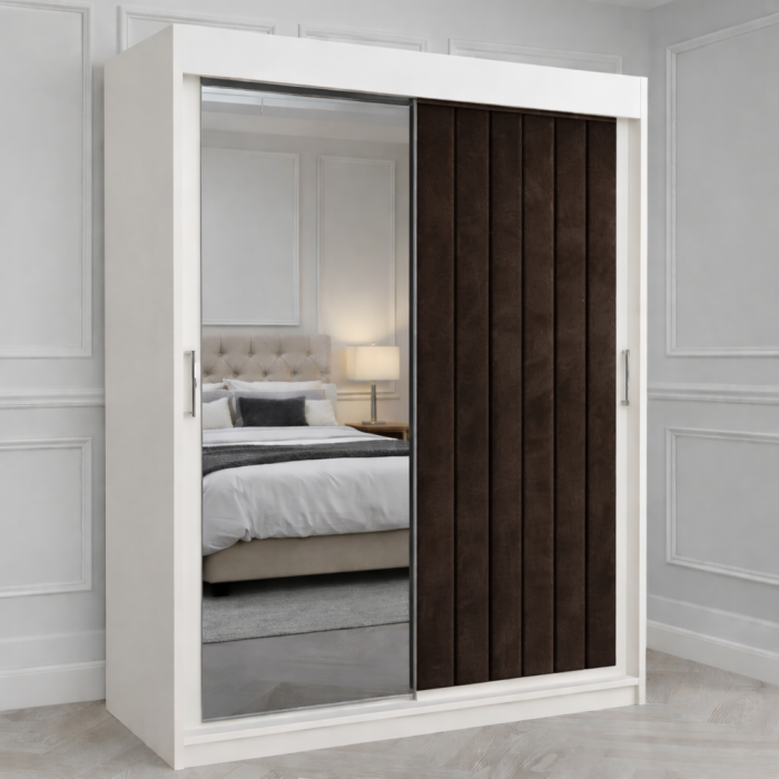 Dressingul Cairo impresionează prin designul său modern și eleganța catifelei premium. Ușile glisante îmbină perfect funcționalul cu esteticul: una este prevăzută cu oglindă full-height, iar cealaltă cu panouri tapițate în catifea, pentru un plus de rafinament. Structura este solidă, practică și se integrează ușor în spațiile contemporane, oferind compartimentare inteligentă și un aspect de lux.
