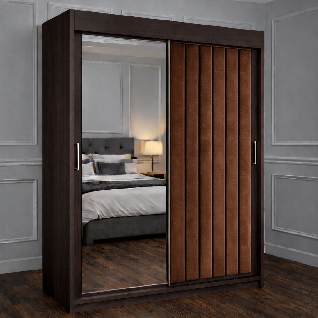 Cairo impresionează prin designul său modern și eleganța catifelei premium. Ușile glisante îmbină perfect funcționalul cu esteticul: una este prevăzută cu oglindă full-height, iar cealaltă cu panouri tapițate în catifea, pentru un plus de rafinament. Structura este solidă, practică și se integrează ușor în spațiile contemporane, oferind compartimentare inteligentă și un aspect de lux.