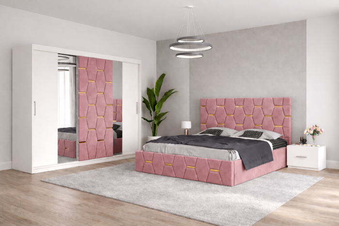 Elementul central al colecției este patul tapițat cu tăblie în model hexagonal 3D, evidențiat prin inserții fine aurii, ce creează un efect vizual sofisticat. Dressingul cu uși culisante și oglindă panoramica adaugă funcționalitate și eleganță, mărind vizual spațiul și asigurând depozitare eficientă. Setul este completat de noptiere minimaliste, în nuanțe neutre, pentru un contrast modern și curat.