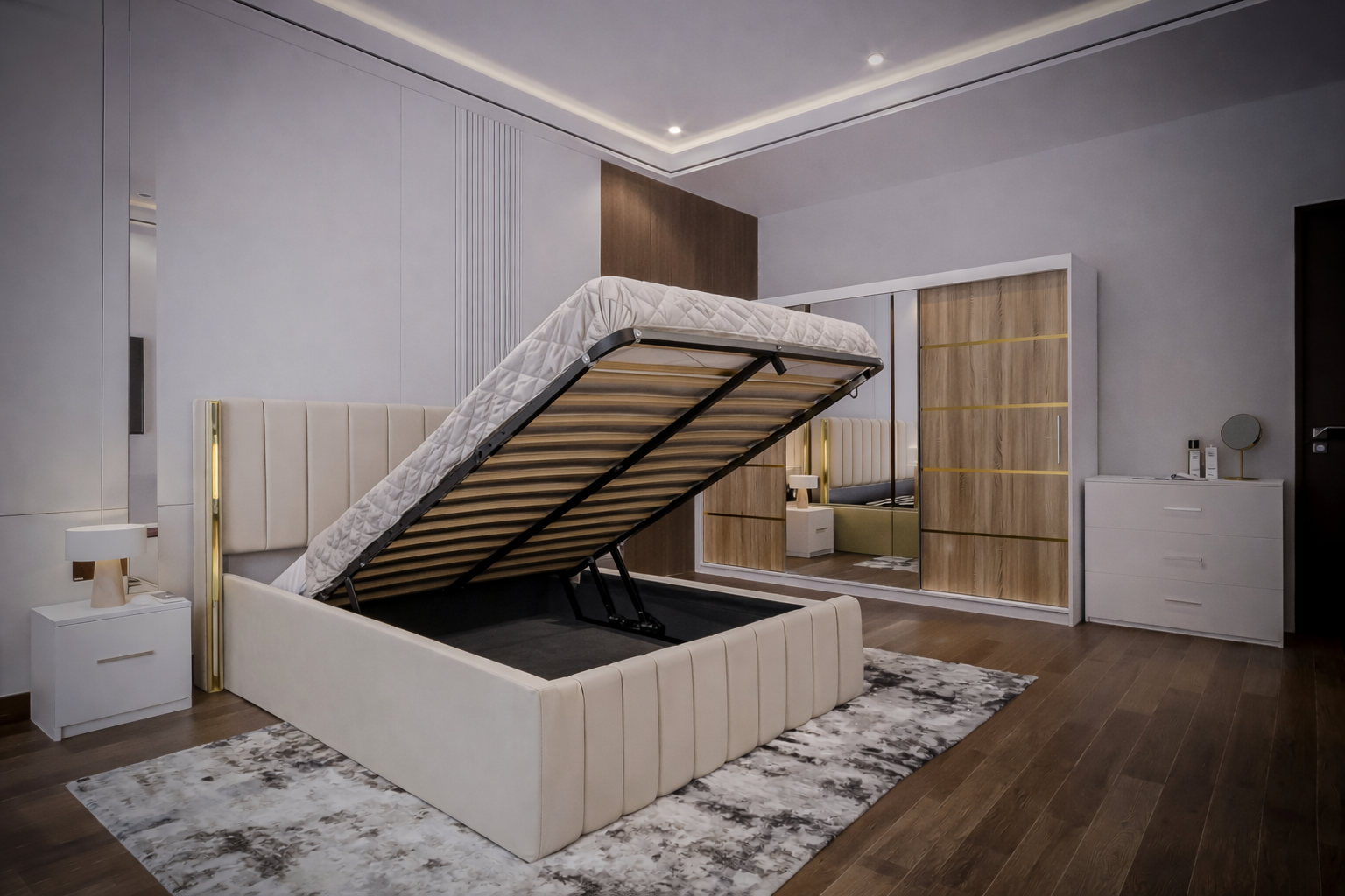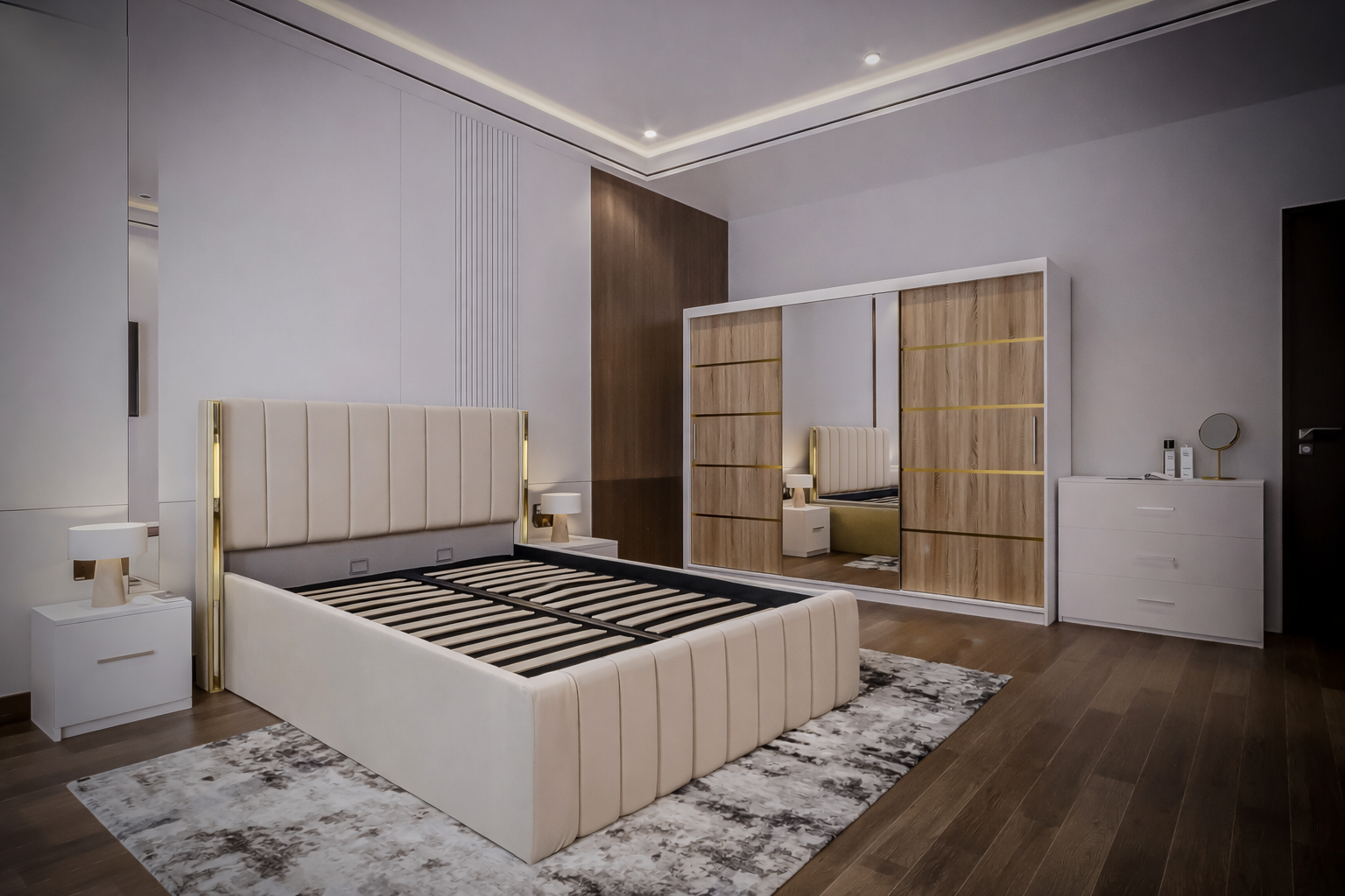 Dormitorul Cairo New impresionează prin designul modern și elegant, dominat de patul tapițat cu tăblie tapițată și accente aurii rafinate. Dressingul cu uși glisante și oglindă panoramică optimizează spațiul, iar nuanțele neutre și finisajele de calitate creează un ambient luxos și armonios. Cairo New — un dormitor contemporan pentru cei care apreciază confortul și stilul.
