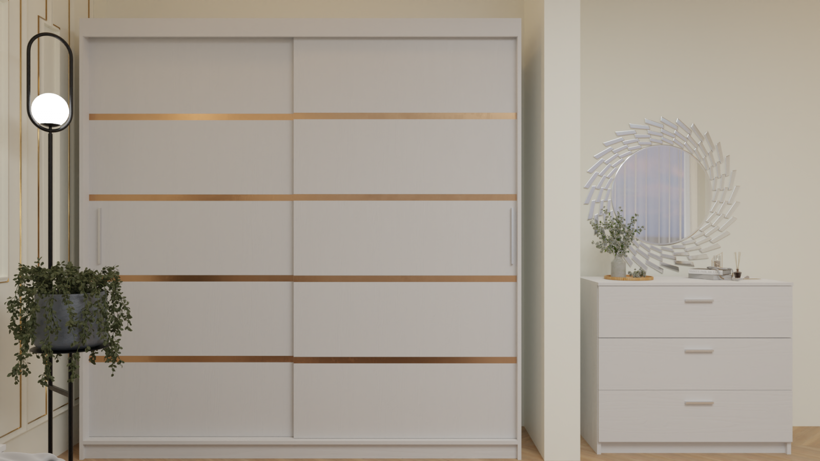 Dormitor Cairo cu Pat Tapitat cu dressing 200*200 usi glisante Alb , noptiere si comoda