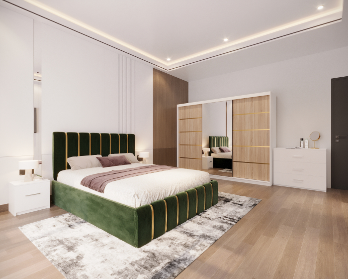Colecția LUX îmbină stilul contemporan cu detalii rafinate, oferind un dormitor complet, creat pentru confort și estetică. Patul tapițat în catifea premium, evidențiat cu detalii decorative aurii, aduce un plus de eleganță și devine piesa centrală a încăperii.