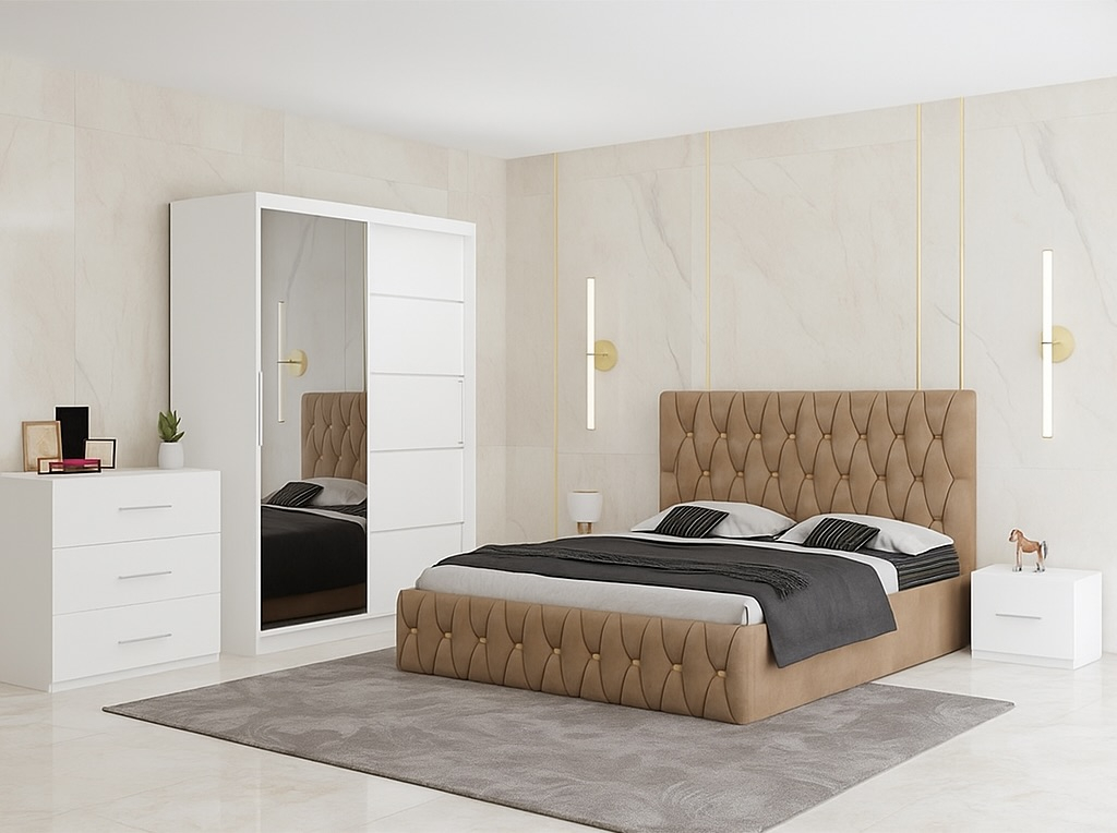 Dormitorul Maldive îmbină eleganța cu confortul modern. Patul tapițat cu tăblie înaltă și dressingul cu uși glisante oferă un aspect rafinat și un plus de funcționalitate, transformând spațiul într-un loc relaxant și plin de stil.