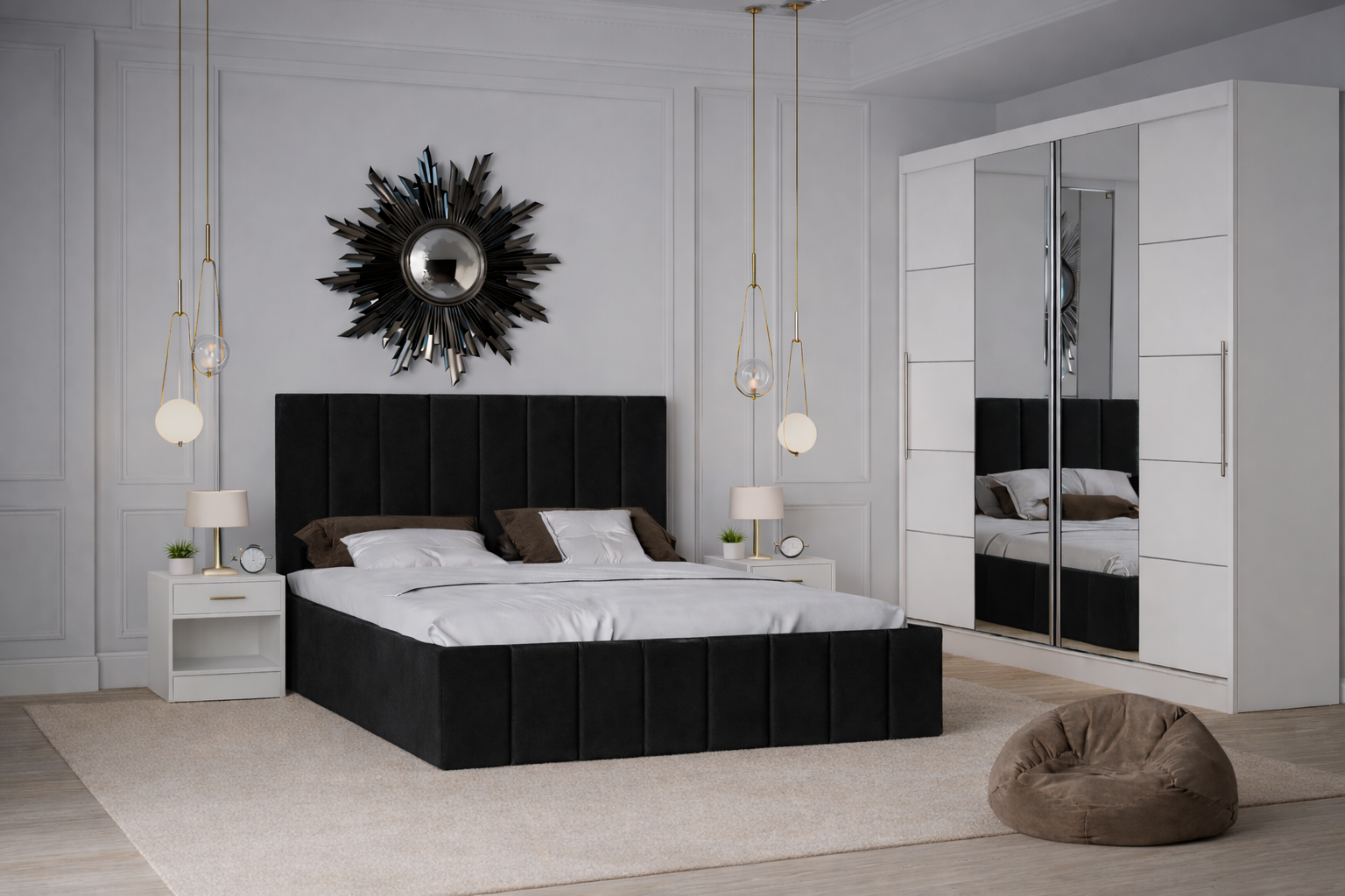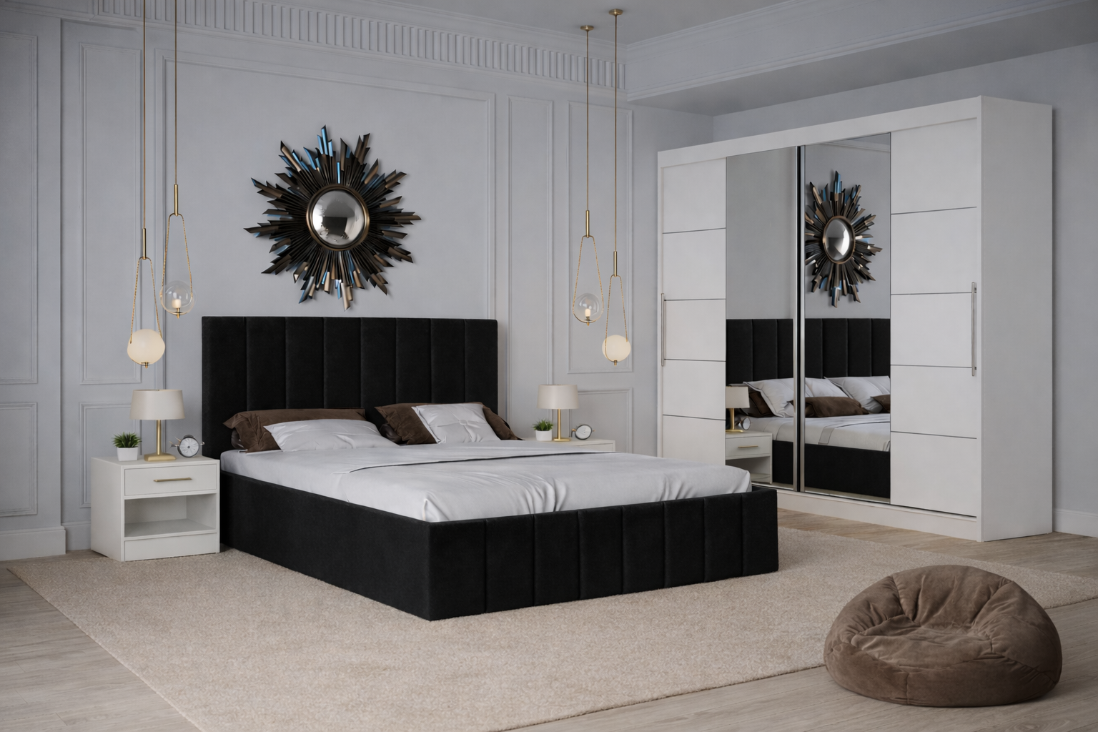 Dormitor Nobless cu Pat Tapițat, Dressing 200x200 Alb și Noptiere