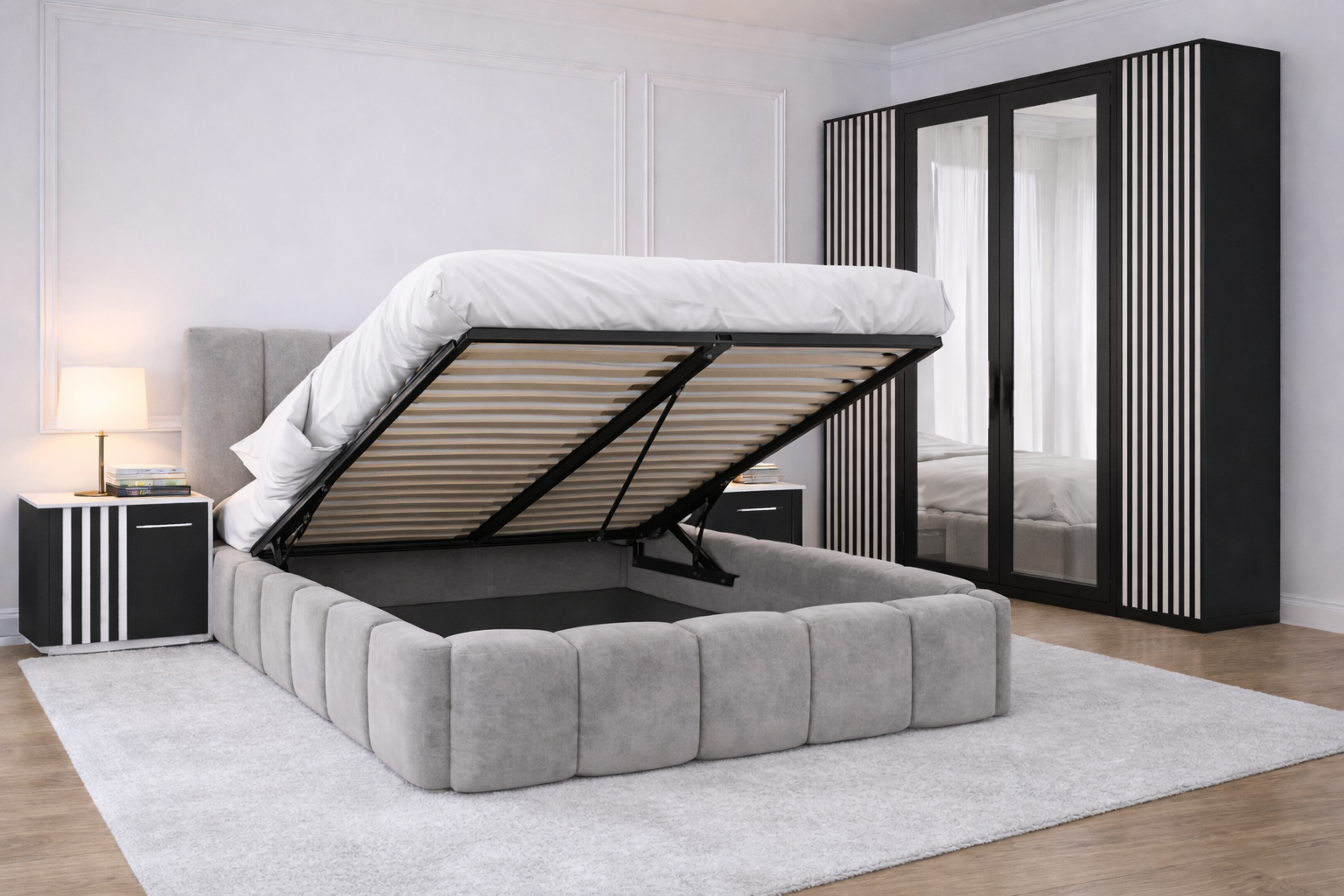 Dormitor Pat Monarch cu Dulap Riflaj Gri Antracit+Alb