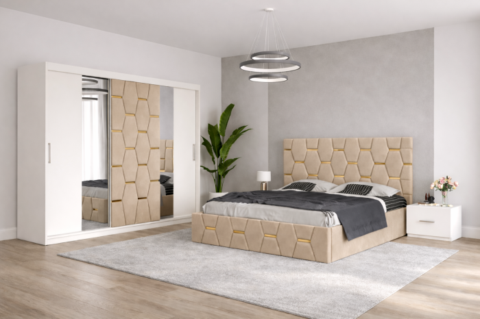 Elementul central al colecției este patul tapițat cu tăblie în model hexagonal 3D, evidențiat prin inserții fine aurii, ce creează un efect vizual sofisticat. Dressingul cu uși culisante și oglindă panoramica adaugă funcționalitate și eleganță, mărind vizual spațiul și asigurând depozitare eficientă. Setul este completat de noptiere minimaliste, în nuanțe neutre, pentru un contrast modern și curat.