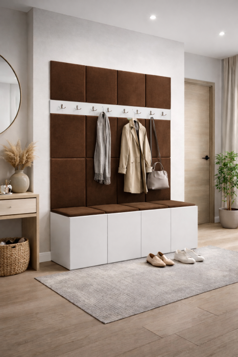 Partea superioară este dotată cu panouri tapițate și cârlige metalice pentru haine, genți și accesorii, în timp ce corpul inferior include un pantofar generos, cu spații bine compartimentate pentru organizarea încălțămintei. Tapițeria oferă confort și protecție pentru perete, iar corpul din PAL conferă rezistență și durabilitate pe termen lung.