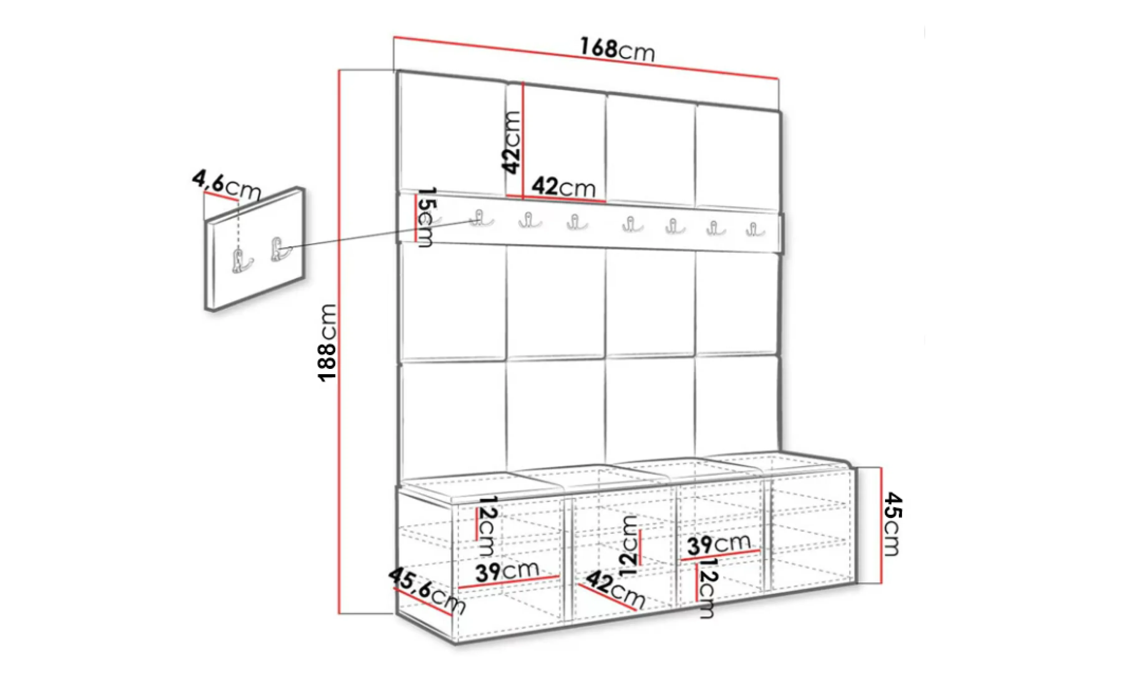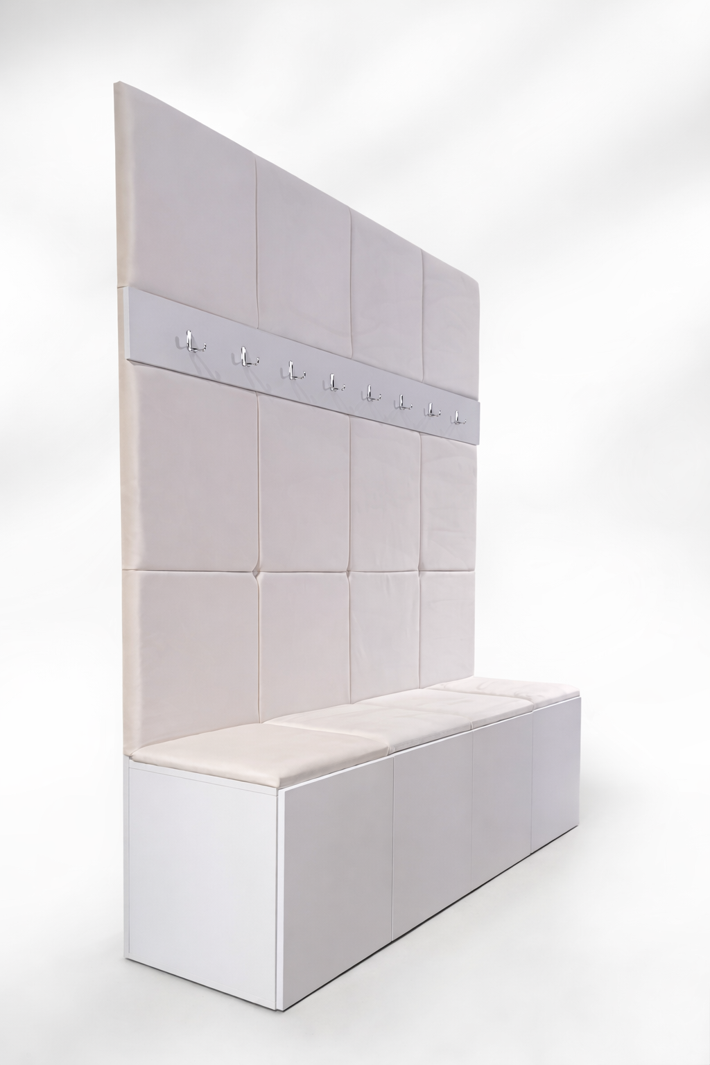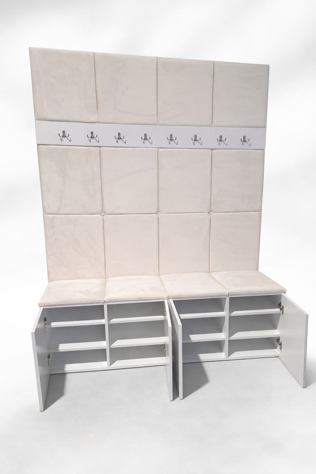 Partea superioară este dotată cu panouri tapițate și cârlige metalice pentru haine, genți și accesorii, în timp ce corpul inferior include un pantofar generos, cu spații bine compartimentate pentru organizarea încălțămintei. Tapițeria oferă confort și protecție pentru perete, iar corpul din PAL conferă rezistență și durabilitate pe termen lung.