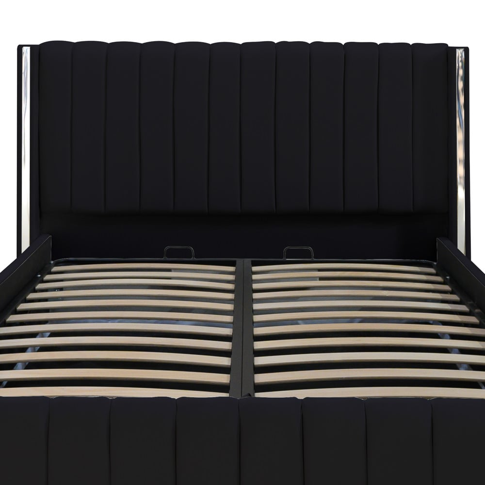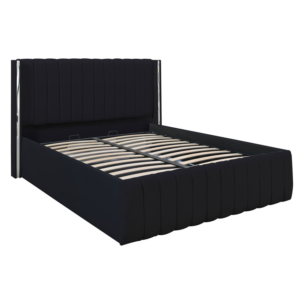 Tăblia înaltă, cu linii verticale atent realizate, oferă un aspect sofisticat și confort vizual, iar inserțiile argintii de pe laterale completează designul cu o notă de lux subtil.