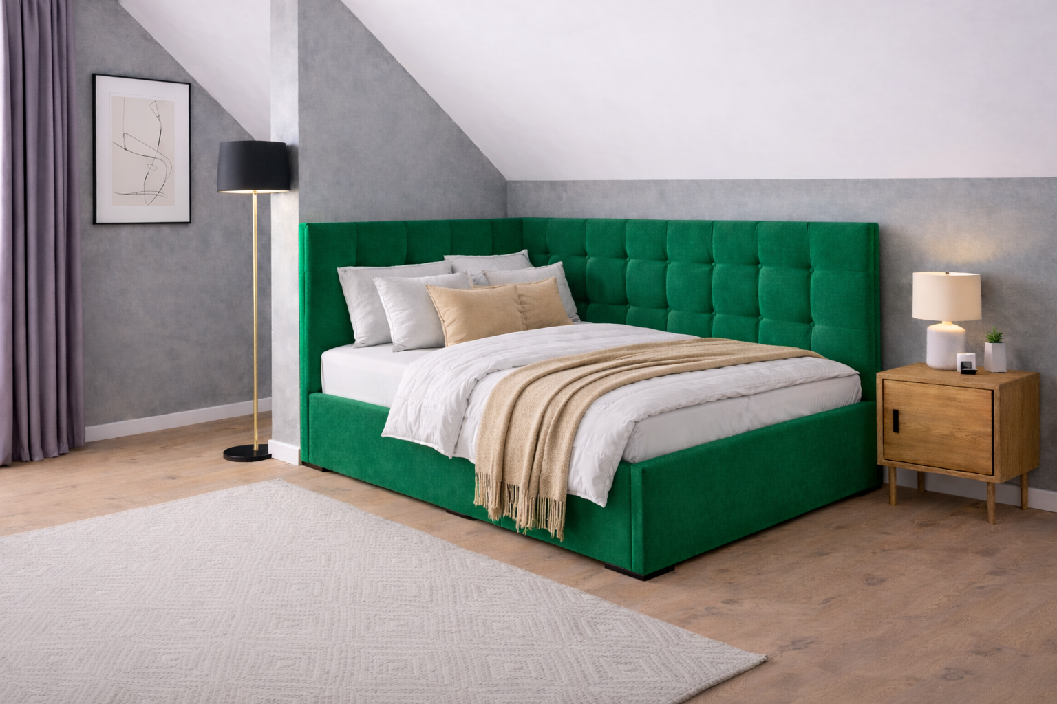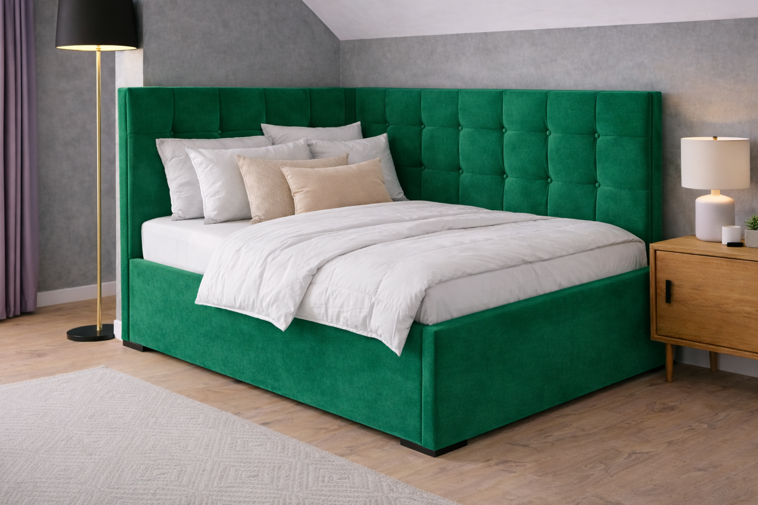 Patul tapițat Regal Corner îmbină eleganța modernă cu confortul desăvârșit. Cu o tăblie de colț tapițată și finisaje premium, oferă un aspect rafinat și o atmosferă caldă în dormitor.
