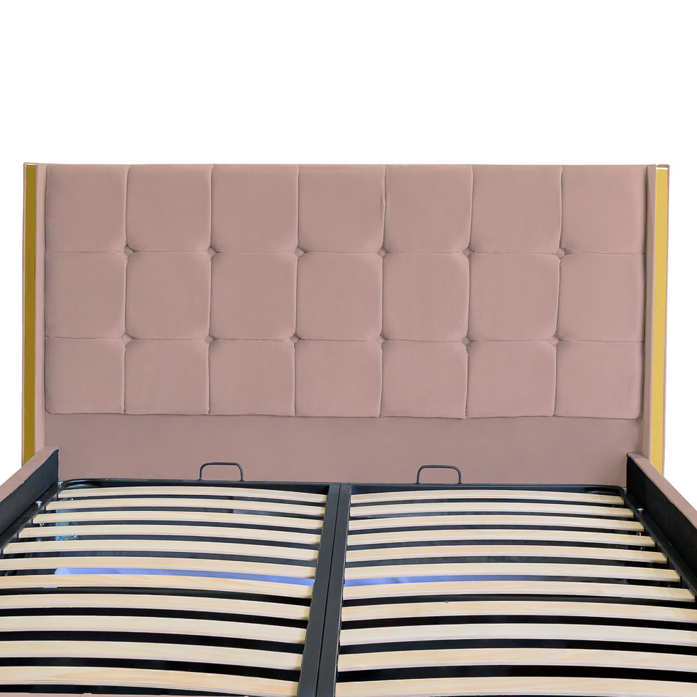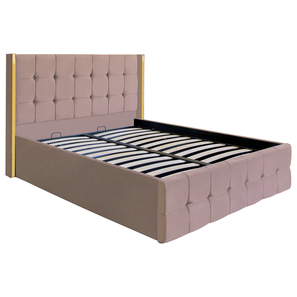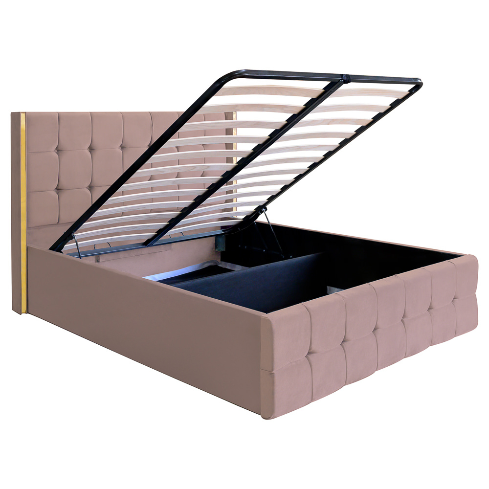 Tăblia înaltă, capitonată cu detalii geometrice, oferă un aspect impunător și un plus de confort atunci când te relaxezi. Structura solidă, realizată din materiale de calitate superioară, asigură rezistență în timp, iar somiera rabatabilă dezvăluie un spațiu generos de depozitare, ideal pentru lenjerii, perne sau alte obiecte personale.