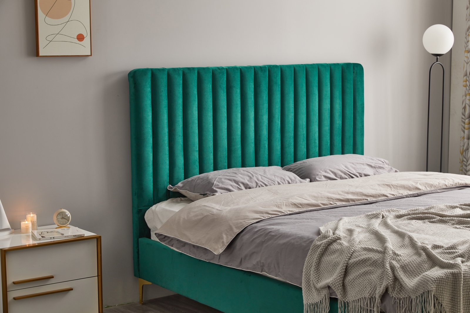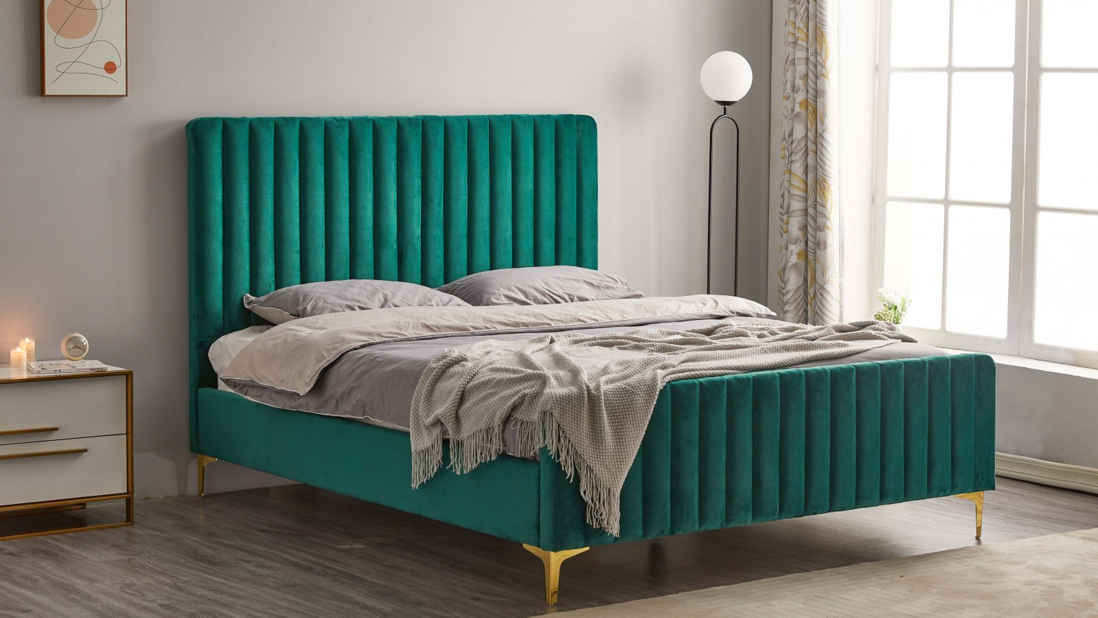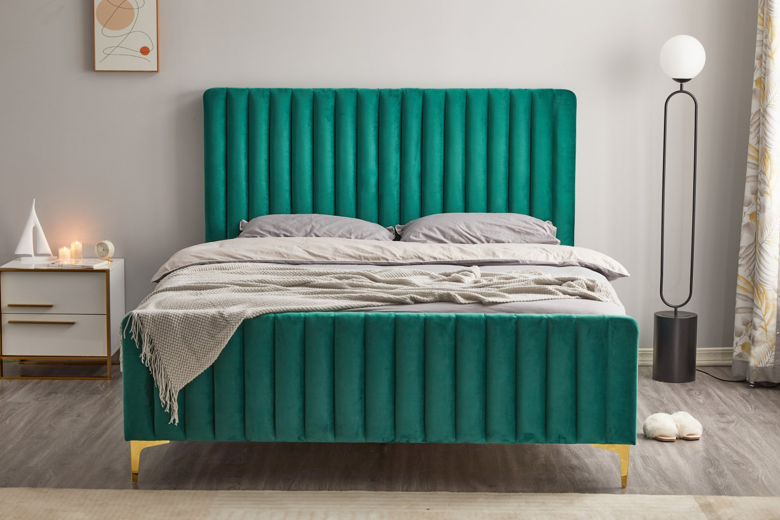 Construcția solidă este completată de picioarele aurii metalice, care adaugă o notă subtilă de lux și rafinament, transformând patul într-o piesă centrală spectaculoasă în orice dormitor.