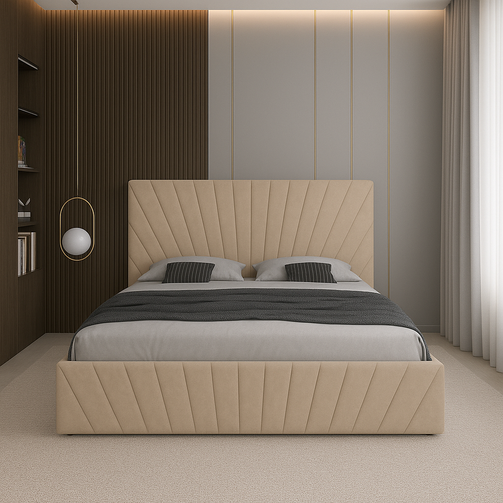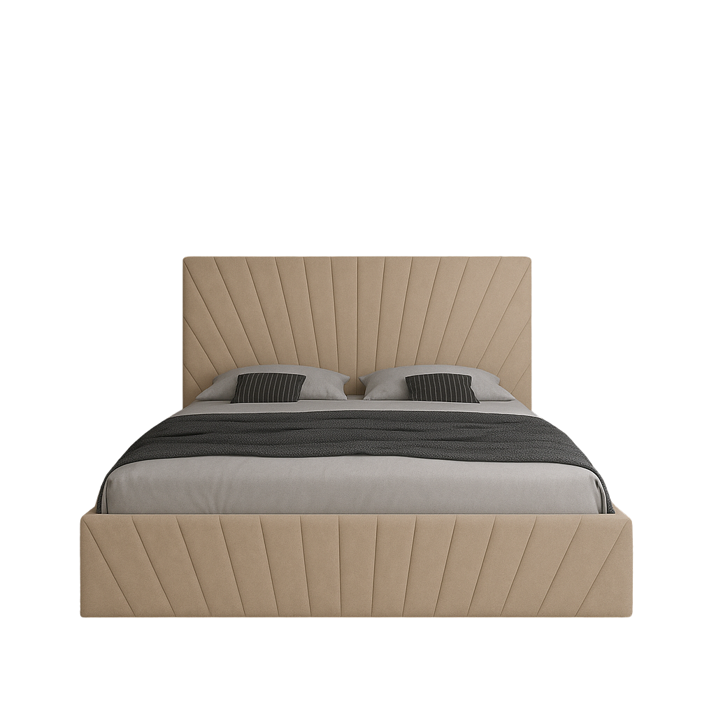 Pat tapițat Solis – eleganță și confort într-un design modern. Realizat din catifea premium, plăcută la atingere și ușor de întreținut, acest model impresionează prin tăblia sa înaltă cu design radial inspirat de razele soarelui. Disponibil în mai multe nuanțe rafinate, Solis transformă orice dormitor într-un spațiu sofisticat și relaxant.